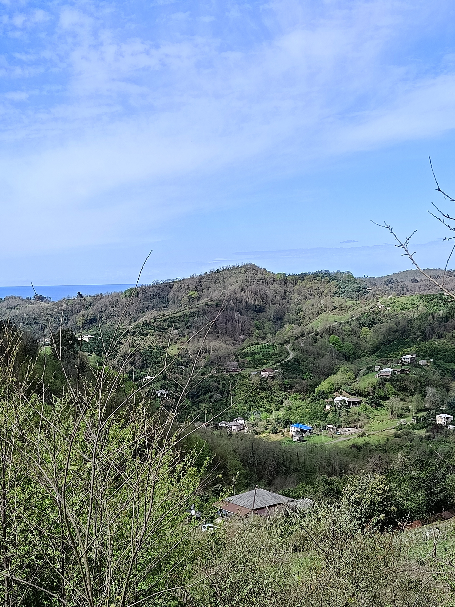 The image shows a hilly landscape with houses scattered across the slopes. The scene appears to be in Yuada-Gulrypsh, Abkhazia, based on the mountainous terrain and architecture. The sky is light blue…read more