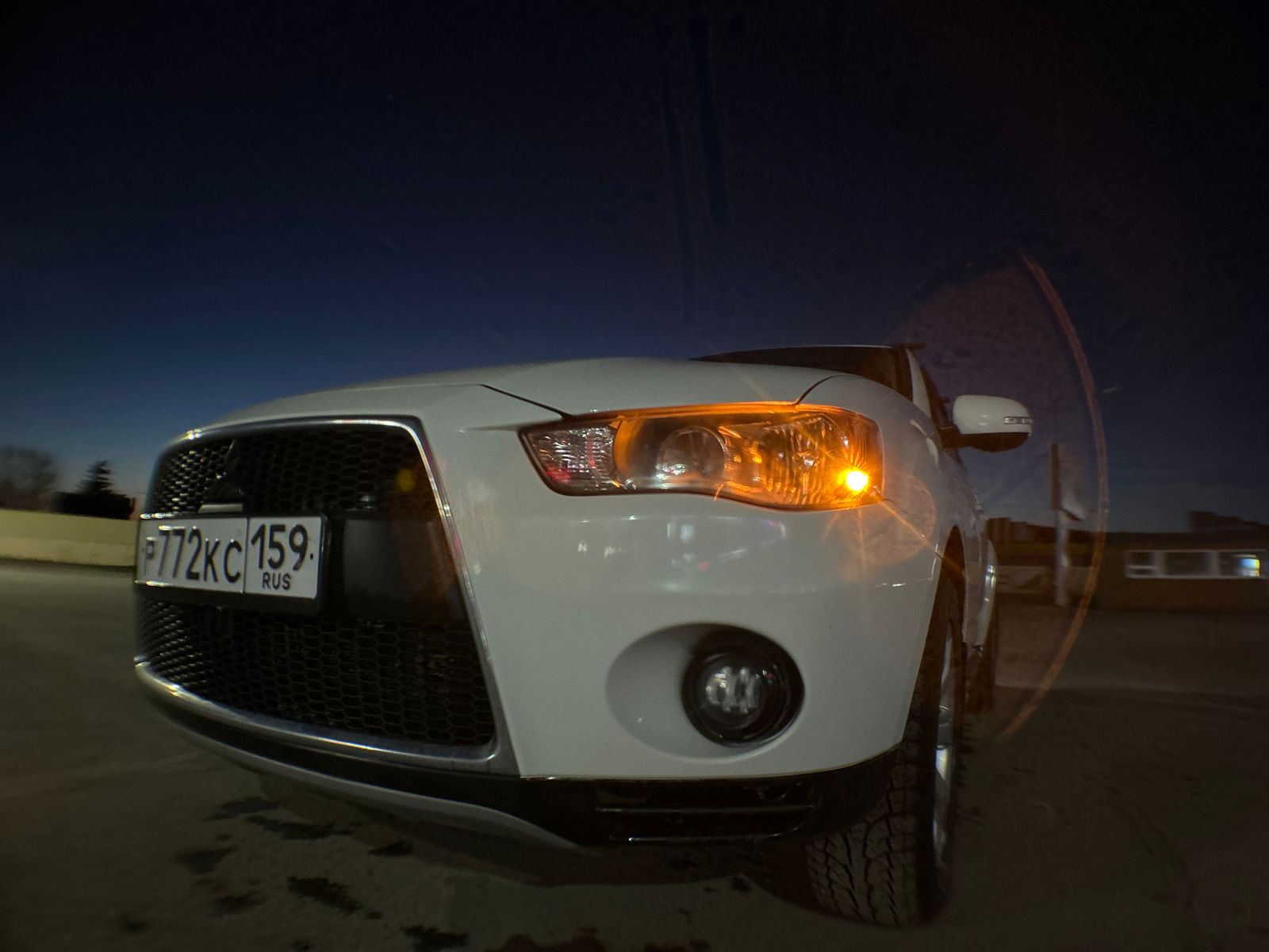 A low-angle, fisheye-lens photograph taken at night features a white Mitsubishi Outlander SUV. The vehicle displays the license plate P772KC 159 RUS, indicating Russian registration. The right headlig…read more