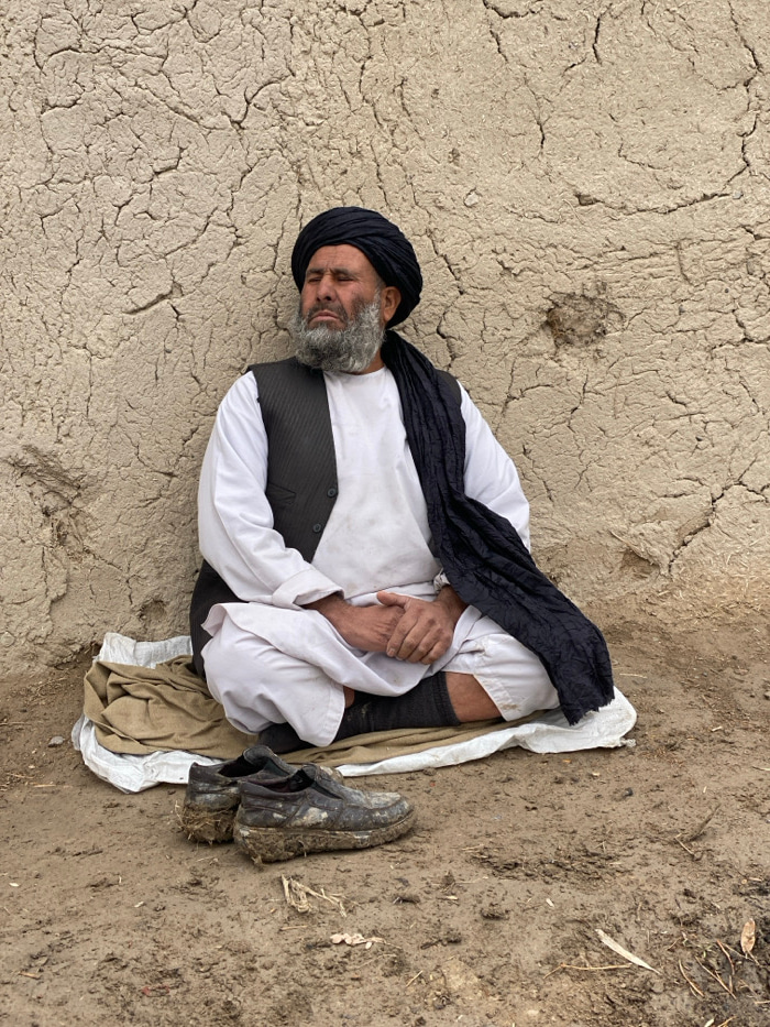 An elderly man with a gray beard and a black turban is lying on his side on a white cloth, which is on the ground near a cracked mud wall. He wears a white shirt, a dark vest, and a black shawl. His h…read more