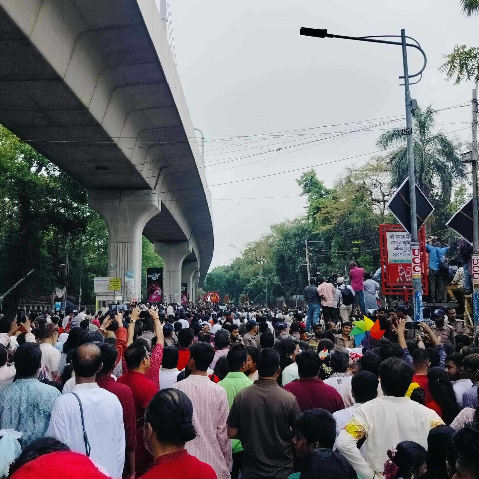 The image shows a large crowd of people gathered on a street in Dhaka, Bangladesh. An elevated road structure is visible above the crowd, supported by concrete pillars. A street lamp stands on the rig…read more