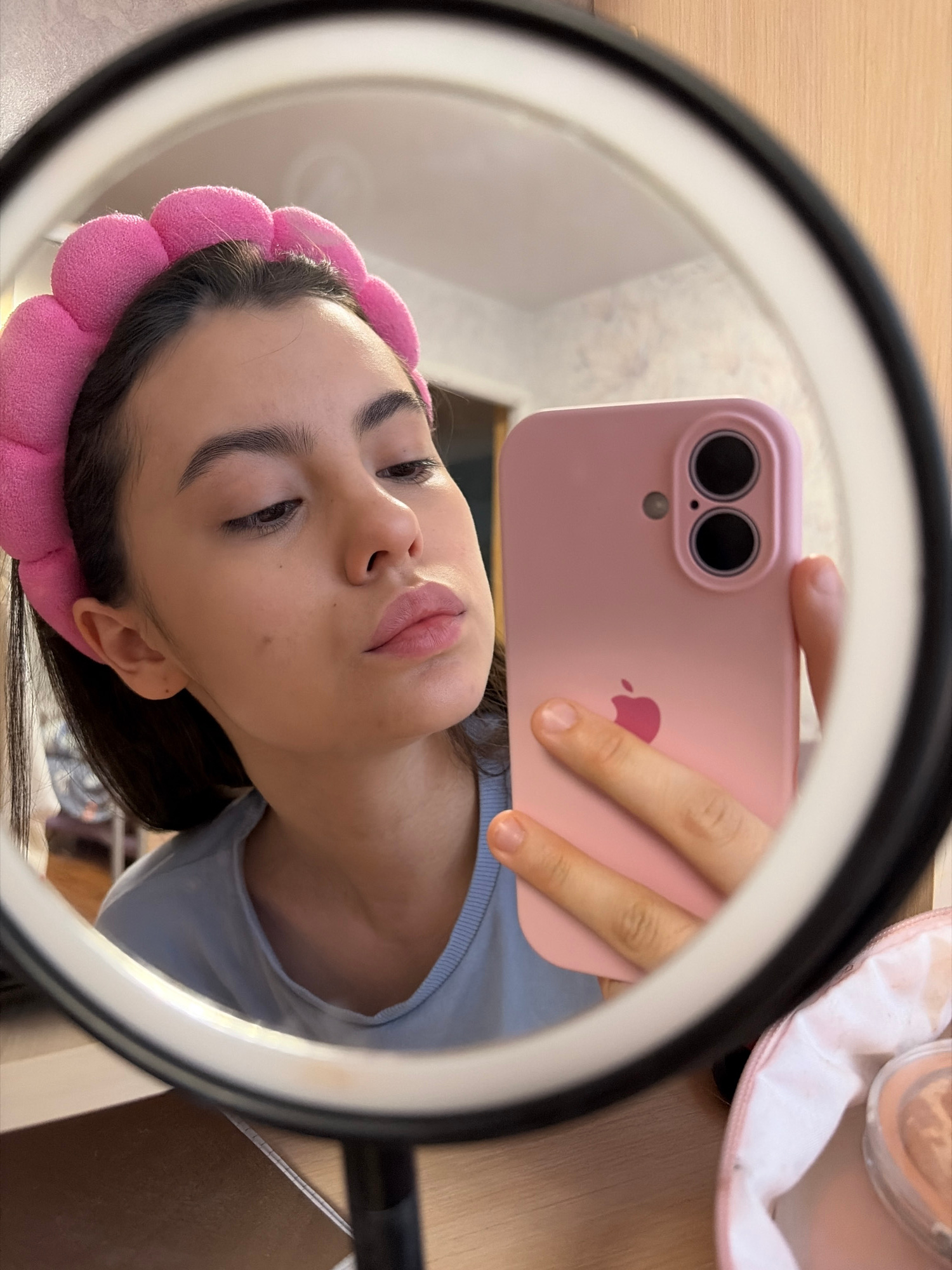 A young woman is taking a selfie in a ring light with a pink iPhone. She is wearing a pink headband and a light blue shirt. The background shows a wooden table and a partially visible makeup bag. The…read more