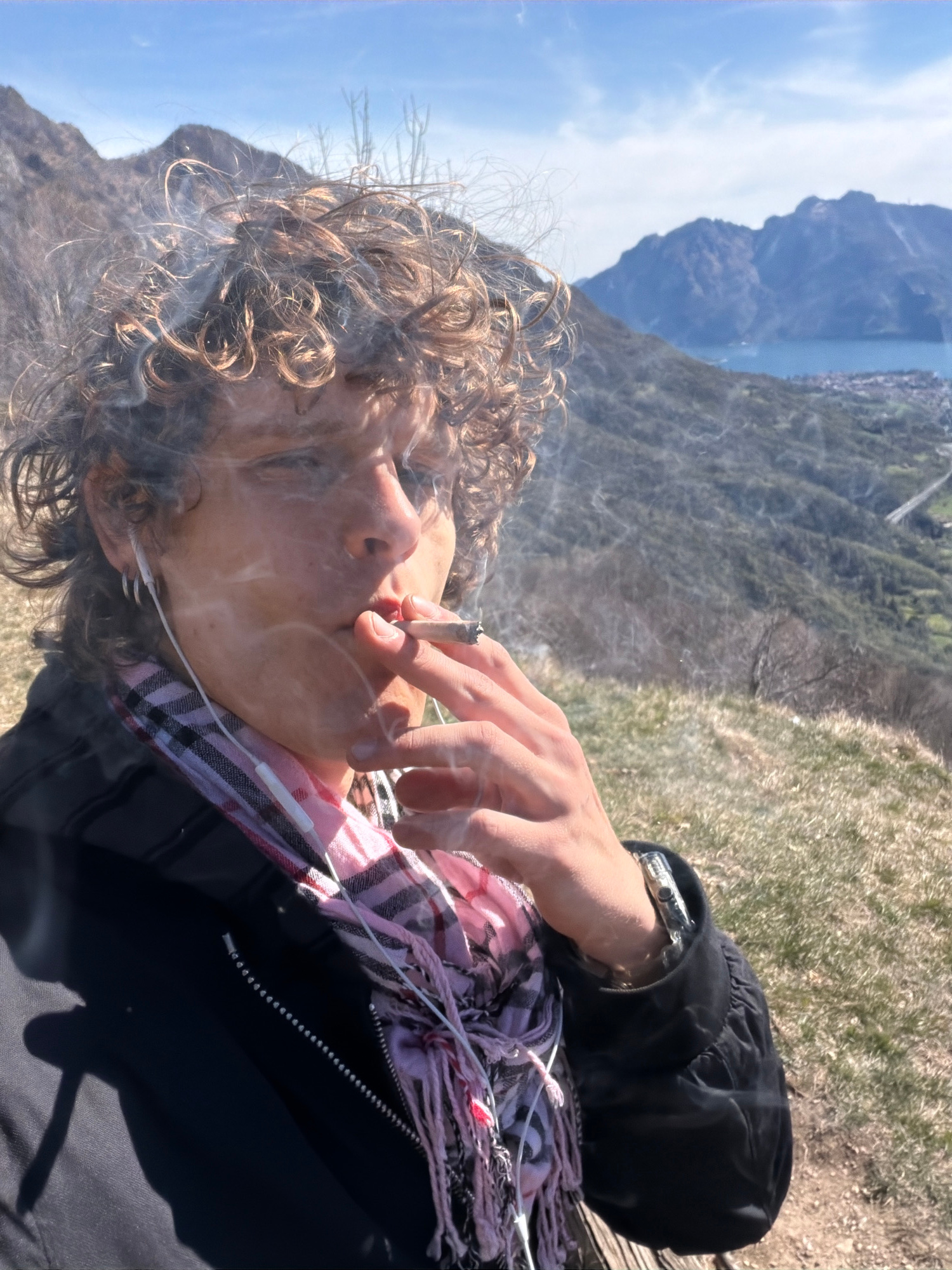 A person with curly hair is smoking a cigarette, exhaling smoke. They are wearing a black jacket and a pink and black plaid scarf. Headphones are draped around their neck. The background includes a laβ¦read more