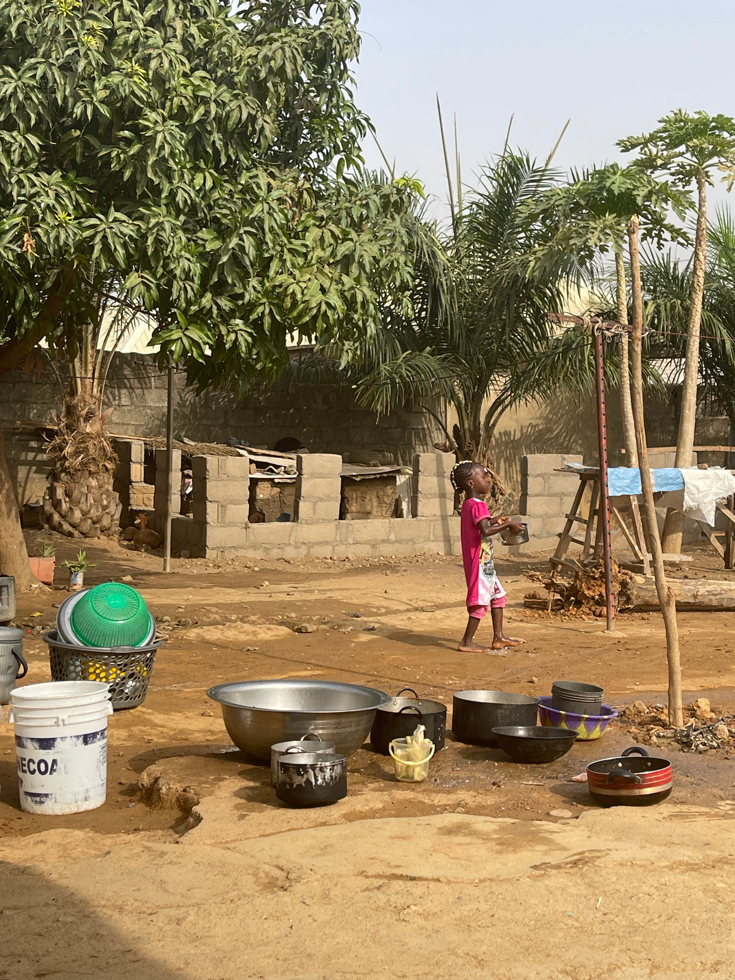 A young girl in a pink dress stands barefoot on a dirt surface in Rido, Nigeria. She is holding a small metal cup to her mouth. Next to her on the ground are various metal pots and pans, as well as a…read more