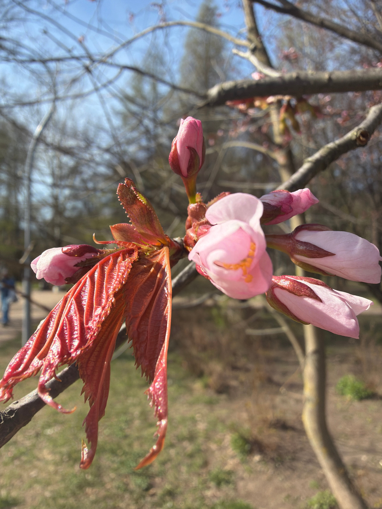 The image displays a close-up of delicate pink flowers and nascent leaves blooming on a tree branch, likely a cherry or similar Prunus species. In the foreground, a cluster of blossoms includes one pa…read more