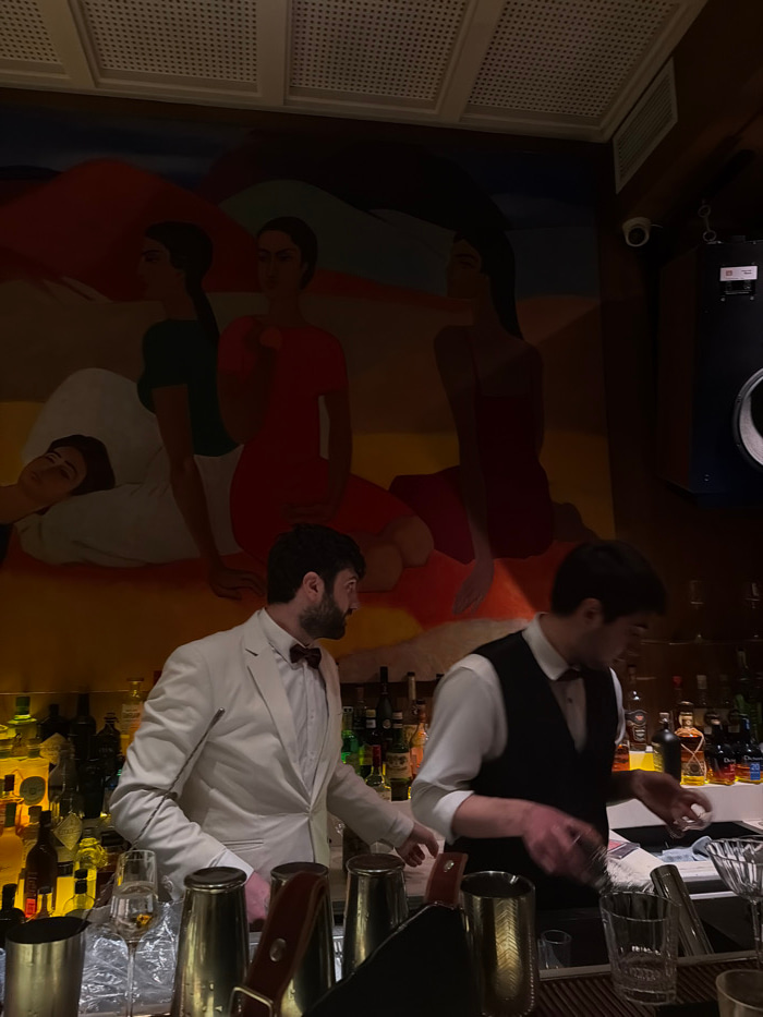 Two men are behind a bar, one in a white suit and bow tie, the other in a white shirt and black vest. Shelves of liquor bottles rise behind them. The floor features a colorful mural of figures in vari…read more