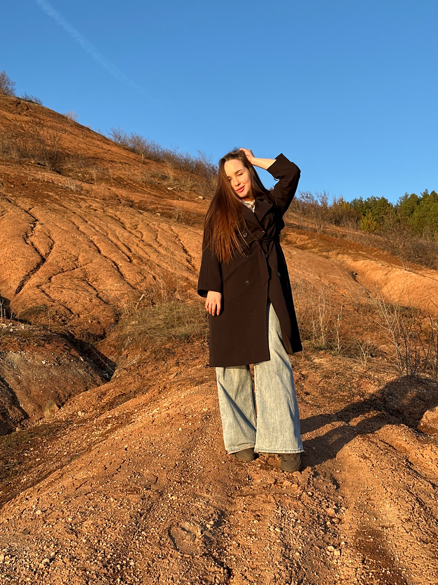 A young woman poses in a full-length shot in Ольховка, Russia. She is standing on a reddish-brown, rocky hillside under a clear blue sky. The woman is wearing light gray jeans, black boots, and a long…read more