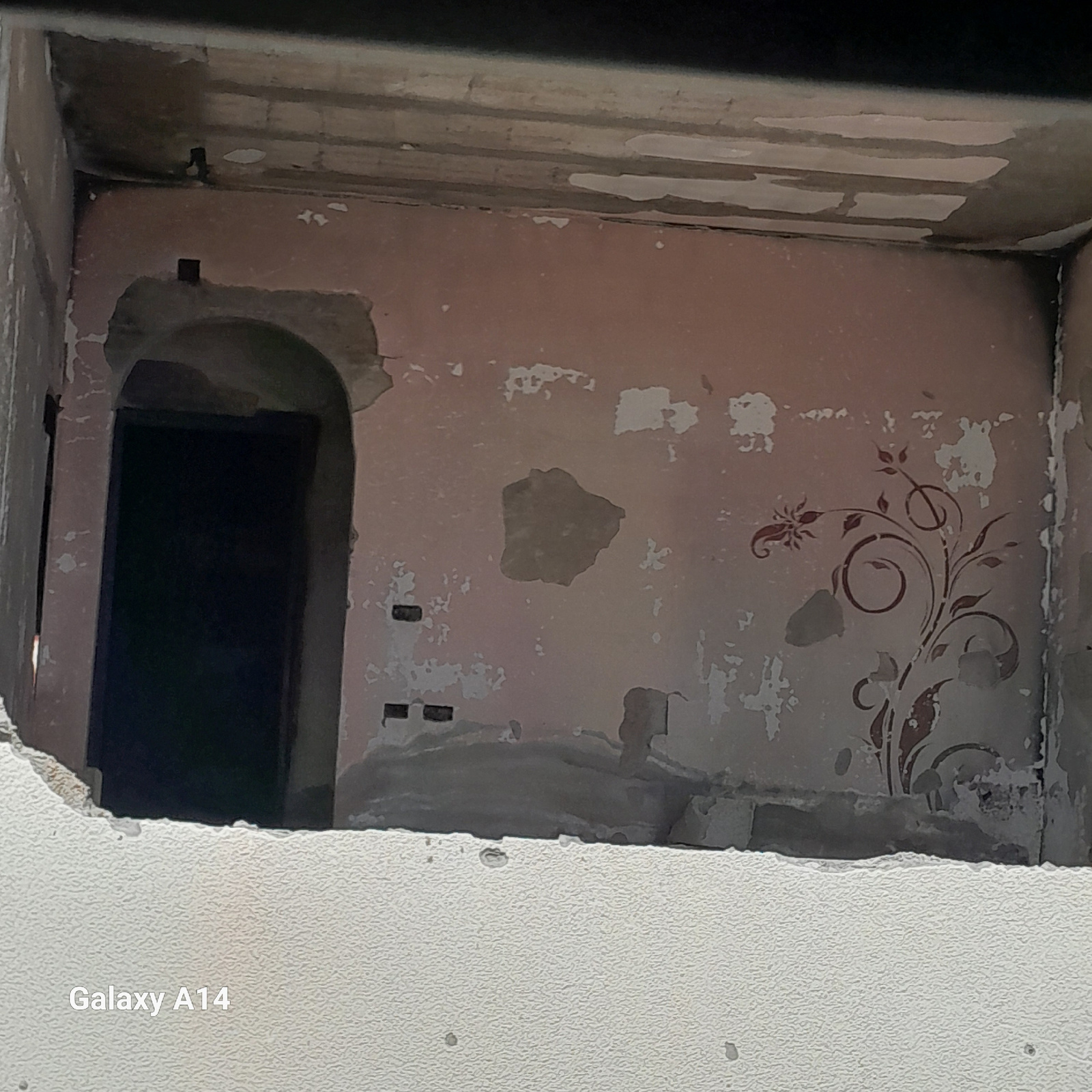 The image shows the interior of a room in disrepair. The walls are pink with peeling paint and some floral decorative patterns. A dark rectangular opening is visible in the lower part of the wall. Par…read more