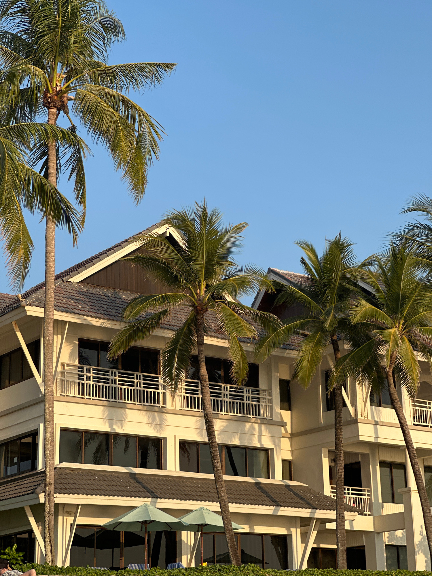 The image displays a multi-story building, likely a resort or hotel, situated in Choeng Thale, Thailand, under a clear, bright blue sky. The structure features a light cream-colored facade with dark-t…read more