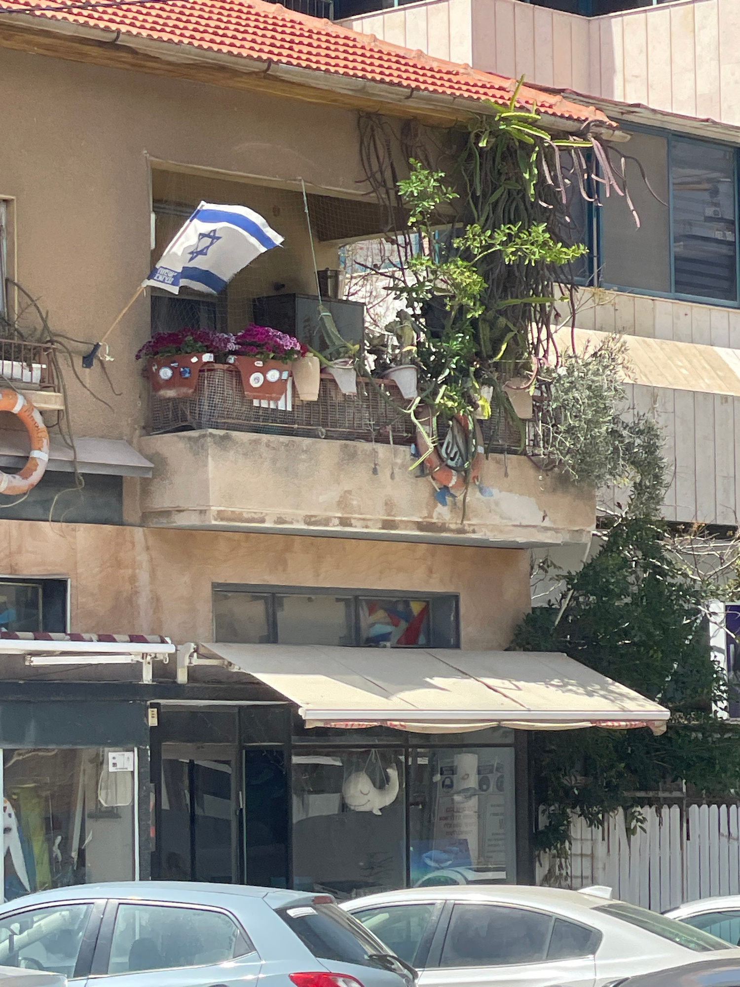 An angled view of a building in Raanana, Israel, reveals various elements. The building is primarily beige, with an Israeli flag waving from a balcony. The balcony also features potted plants. A car i…read more