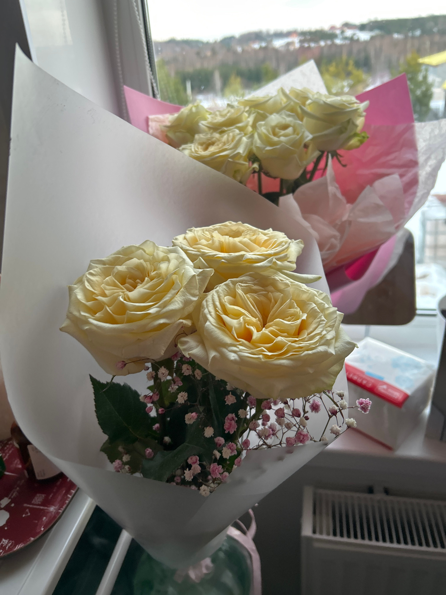 The image displays two bouquets of light yellow/cream roses positioned indoors on a windowsill overlooking an outdoor landscape. In the foreground, a bouquet of three prominent roses is wrapped in whi…read more