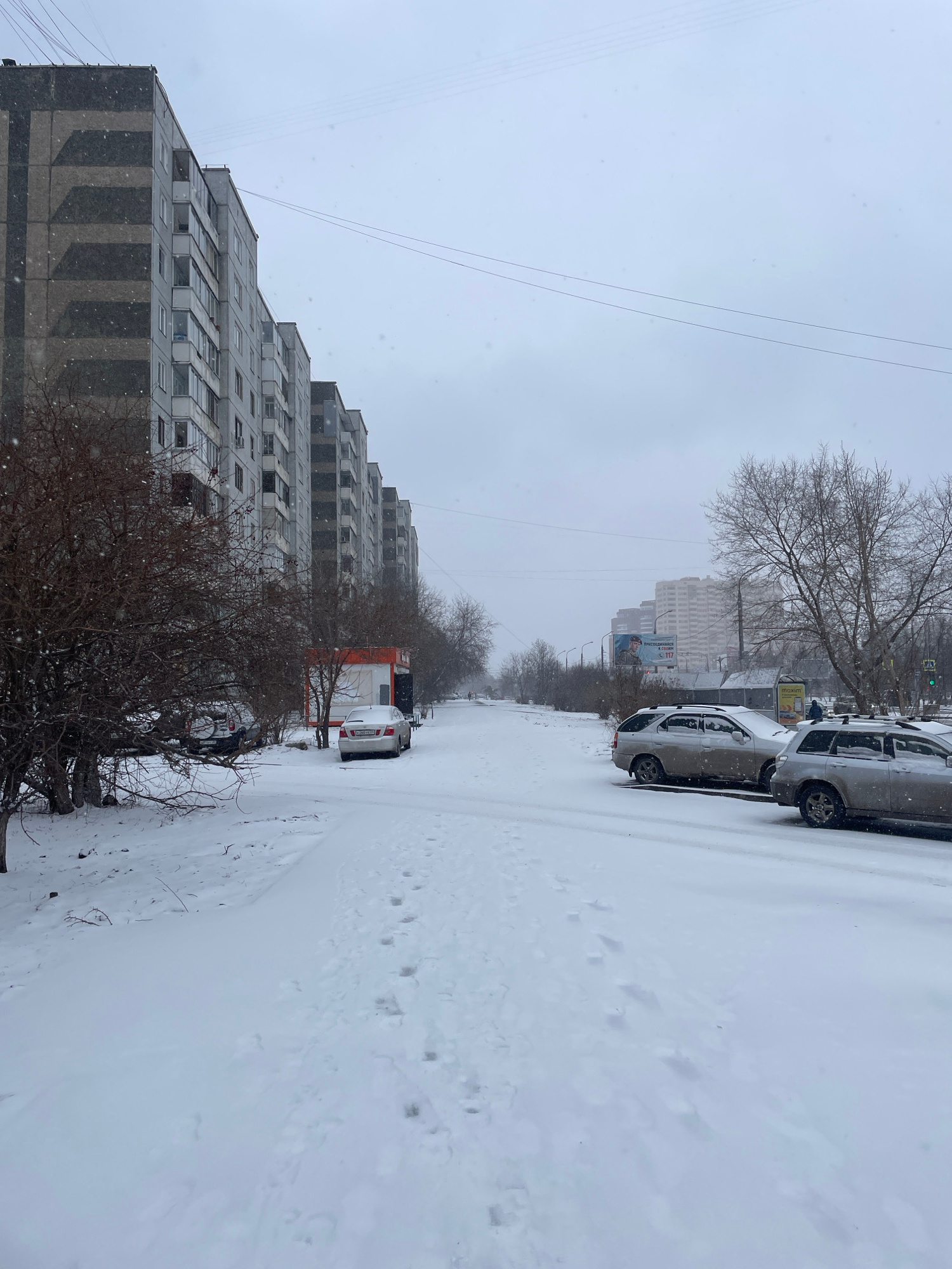 The scene is a snowy street in Krasnoyarsk, Russia. A tall, grey apartment building with a stepped design is on the left side of the frame. On the right side of the street, two light-colored cars are…read more