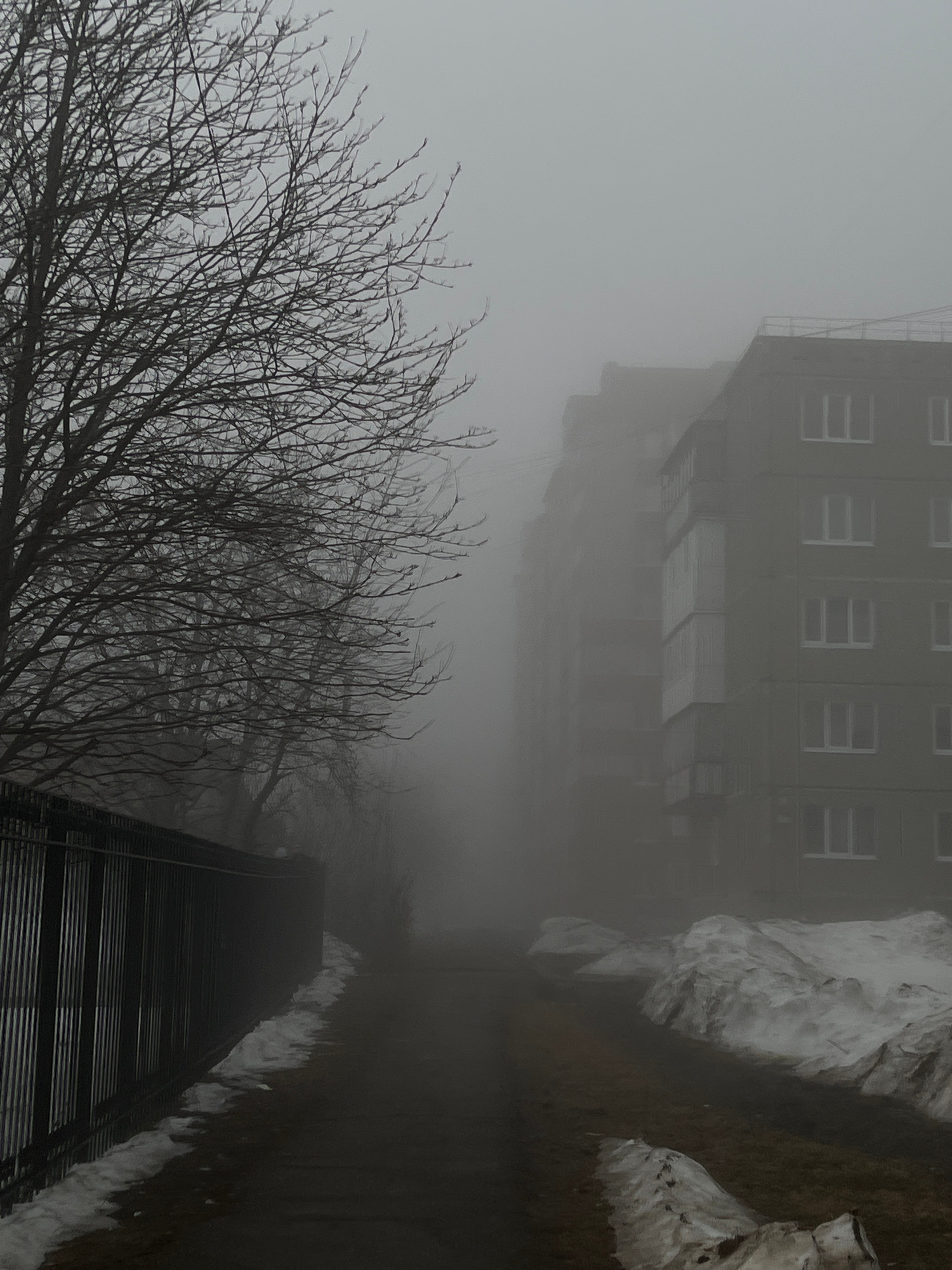 A muted, overcast scene in Neftekamsk, Russia. Bare branches dominate the lower left quadrant, contrasting with the indistinct, tall building in the background, obscured by heavy fog. The building app…read more