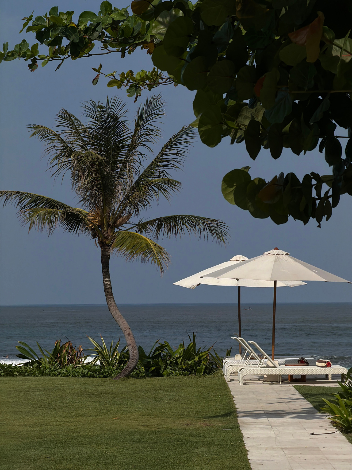 The image portrays a coastal landscape in Belalang, Indonesia, under a clear, light blue sky. In the foreground, a manicured green lawn occupies the left side, meeting a light-colored paved pathway on…read more