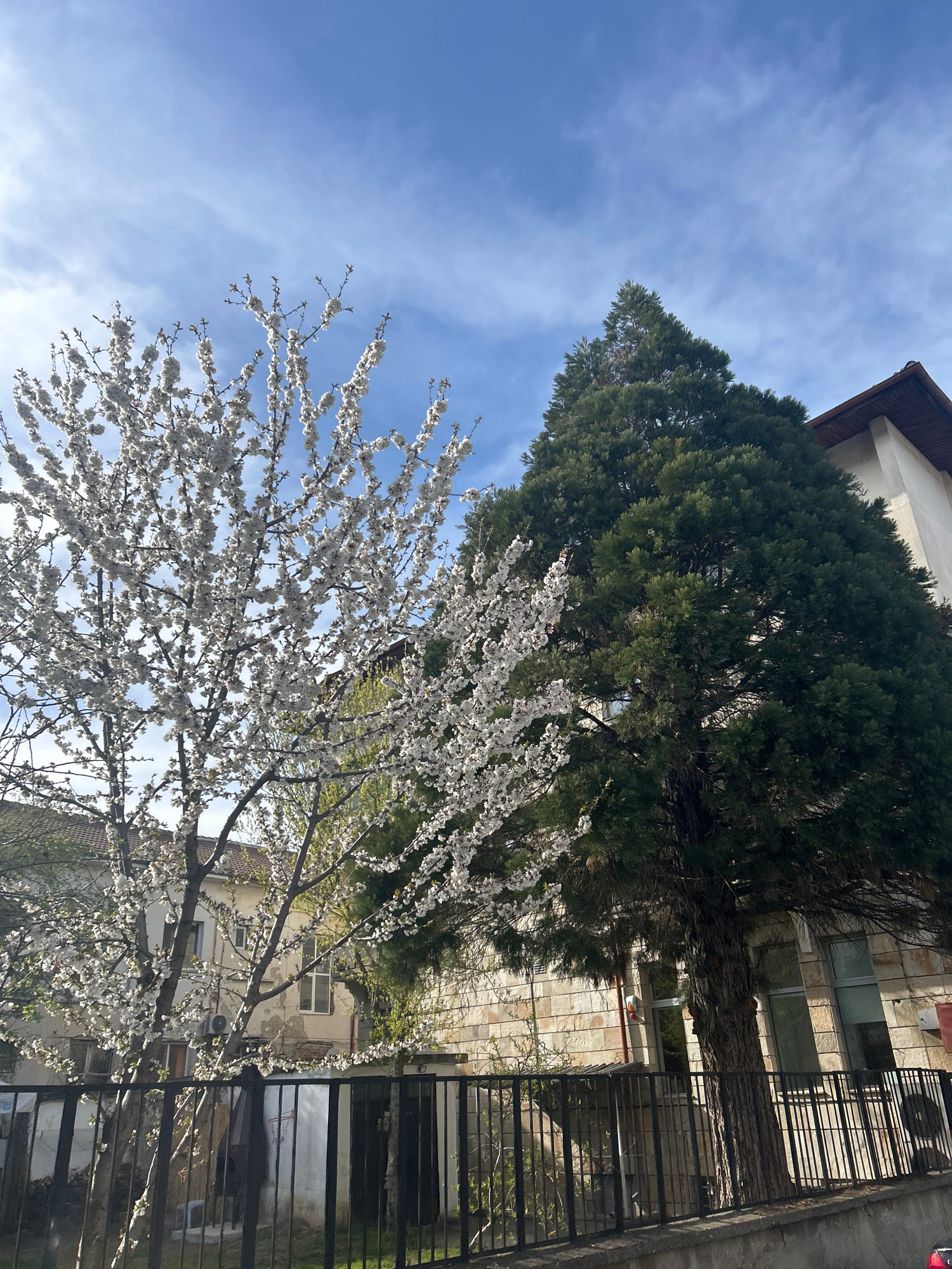 This image, set in Zlatograd, Bulgaria, captures an outdoor scene dominated by natural elements and architectural structures under a clear sky. In the foreground and midground, a profusely blooming t…read more