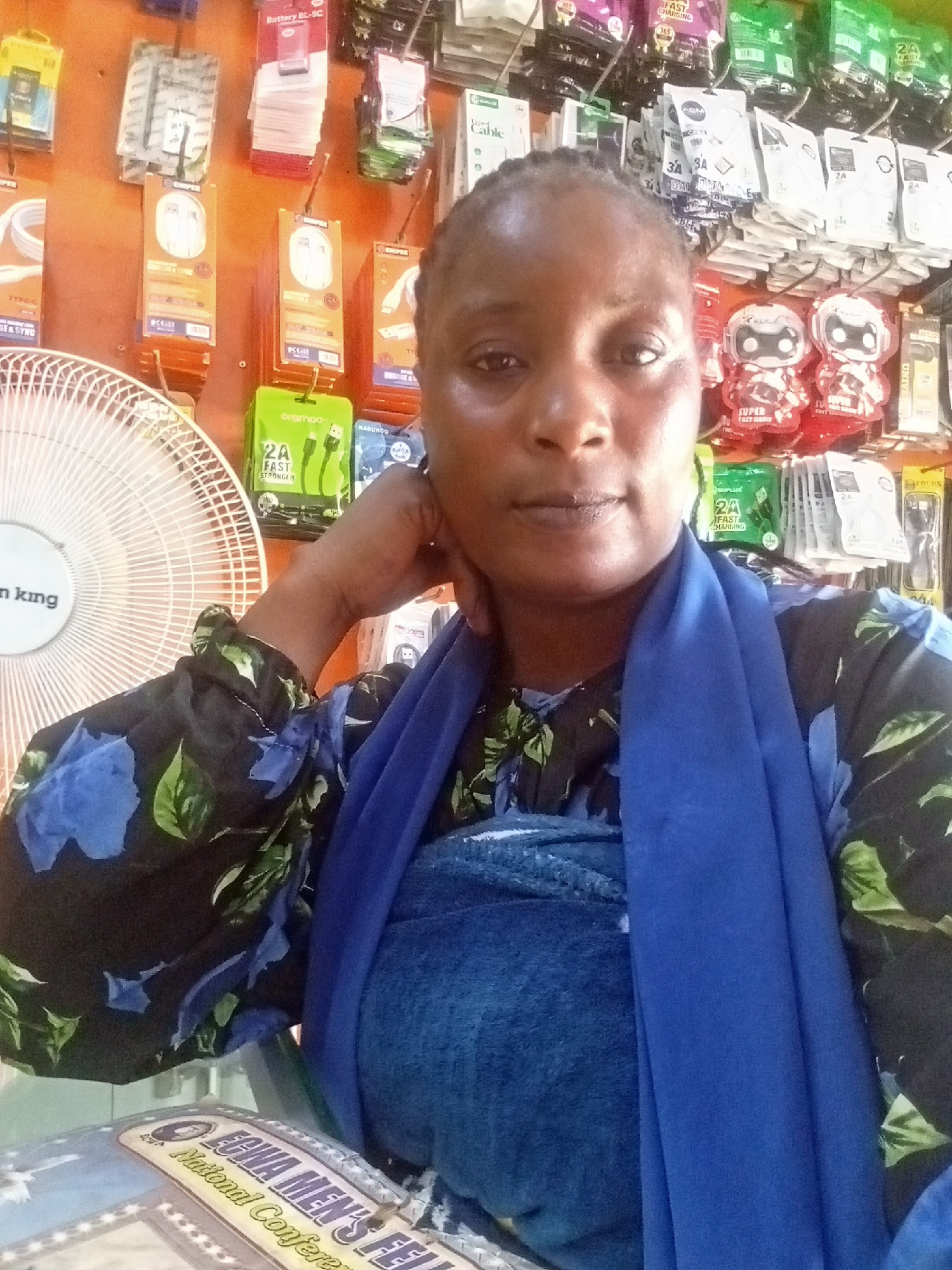 The image shows a woman in Akwanga, Nigeria, posing for a photo in what appears to be a small retail shop. The woman is wearing a blue scarf and a black blouse with a blue floral pattern. She rests he…read more