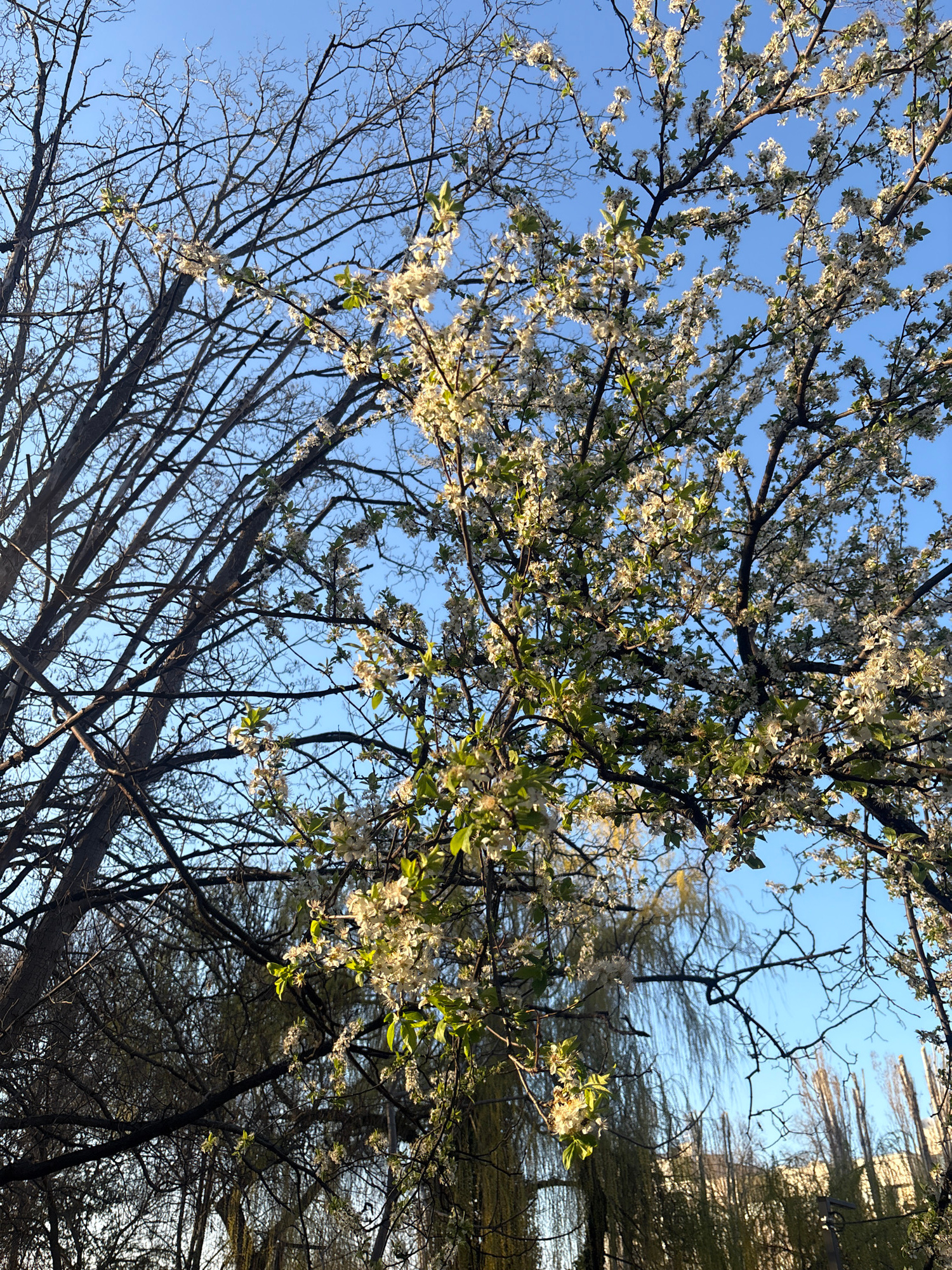 The image shows a view looking up through tree branches towards a blue sky. Some of the branches are bare, while others have small white blossoms and green leaves. Some buildings are faintly visible i…read more