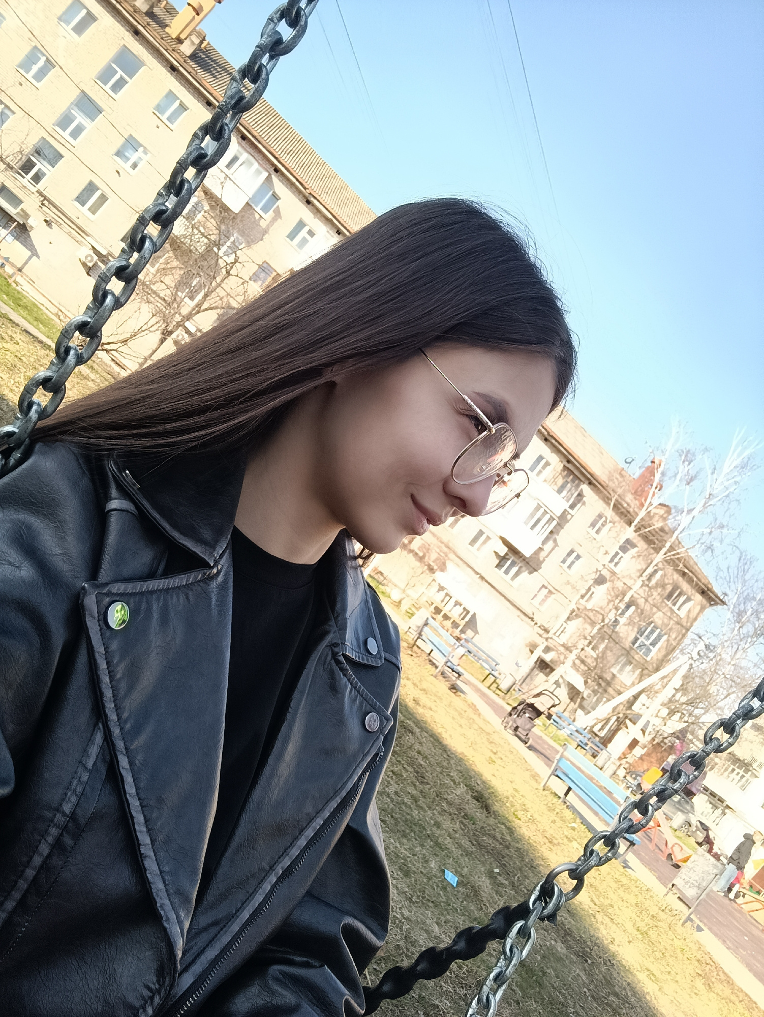 The image shows a young woman in a black leather jacket and glasses, sitting on a swing. The location appears to be a playground in a city, with apartment buildings in the background. There are chains…read more