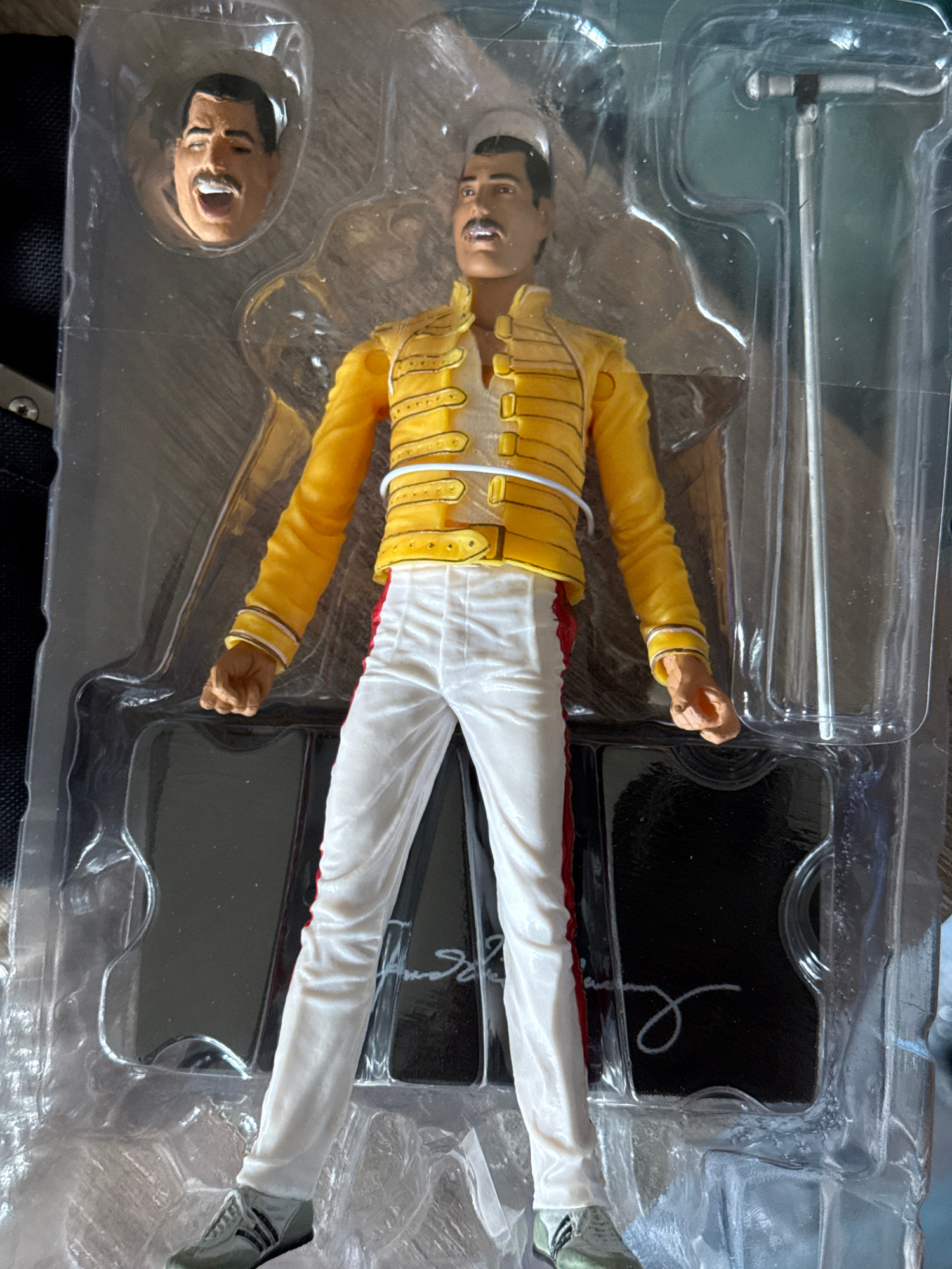 The image shows a plastic blister pack containing a Freddie Mercury action figure dressed in his iconic yellow jacket and white pants. Accessories included are a microphone stand and an alternate head…read more