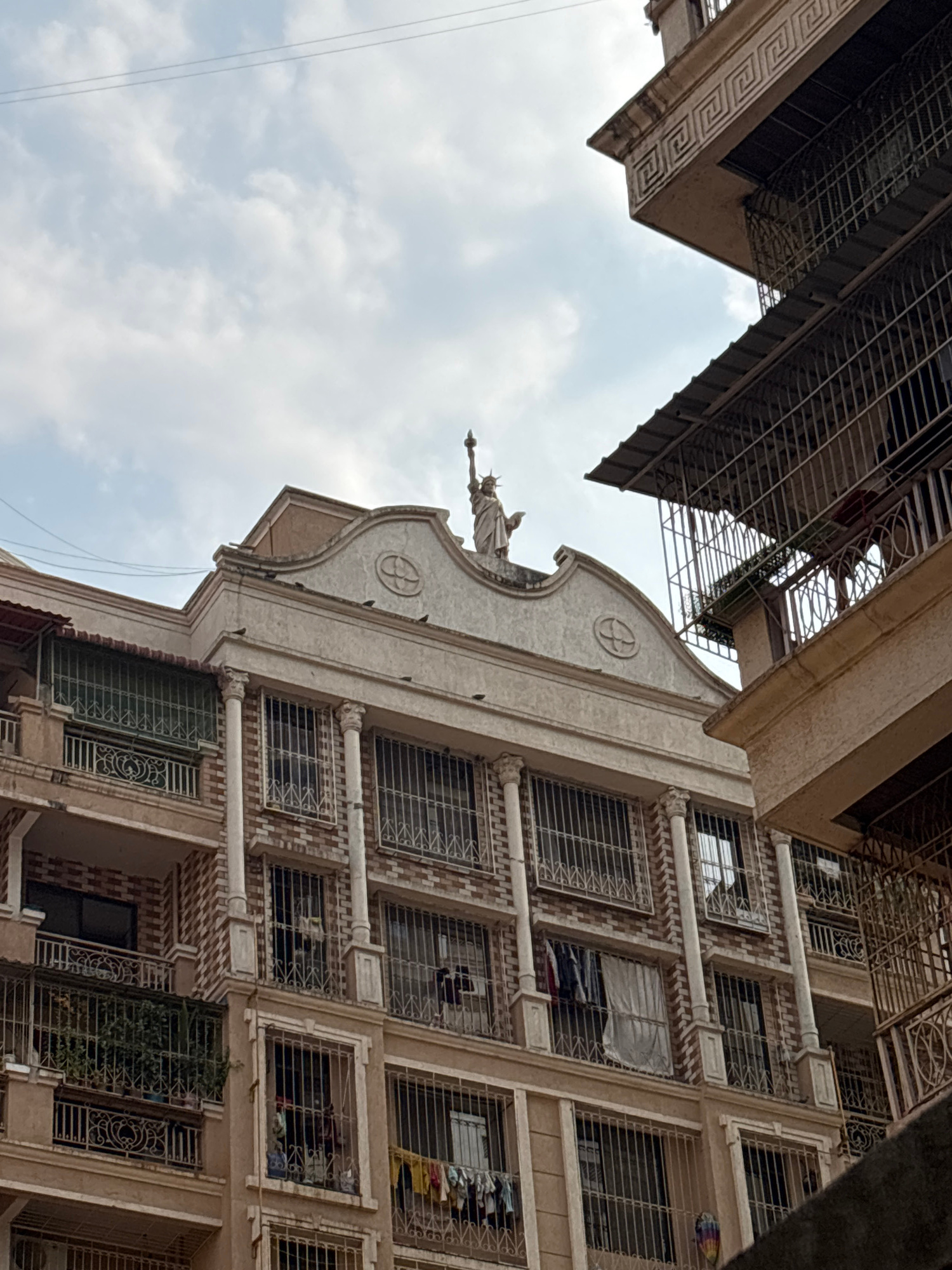 The image displays a multi-story residential building in Ambernath, India, under a cloudy, overcast sky. The central structure features a cream-colored facade with decorative elements, including verti…read more