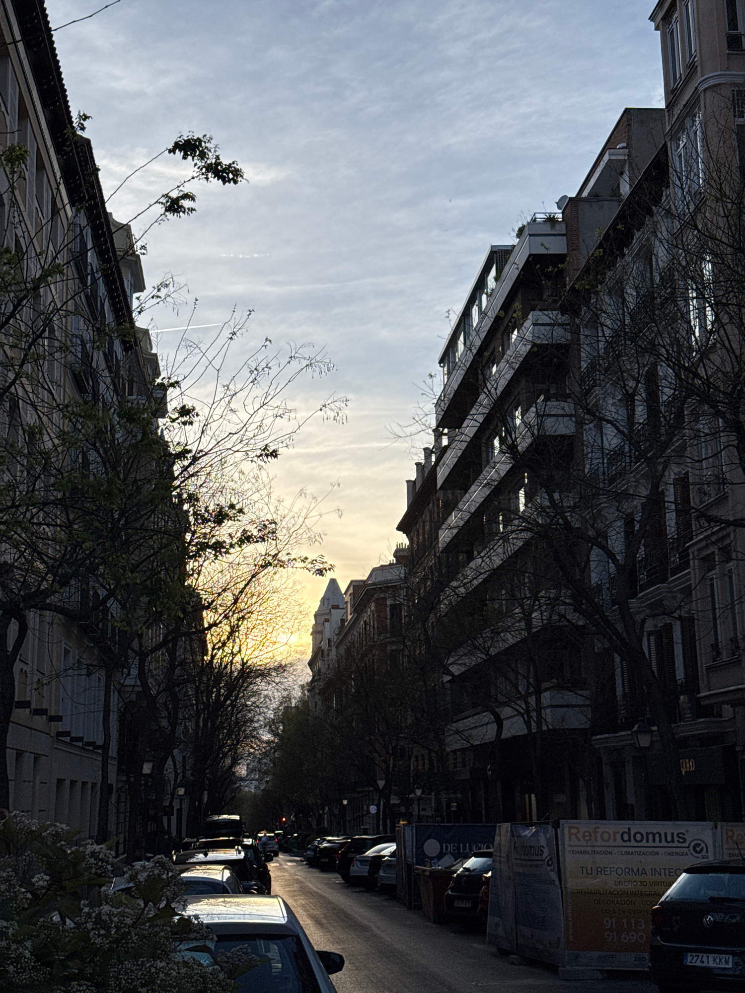 The image captures a street in Madrid, Spain, at dusk. The low angle of the sun casts a warm glow between buildings, silhouetting trees. Buildings flank both sides of the street, one side featuring ba…read more