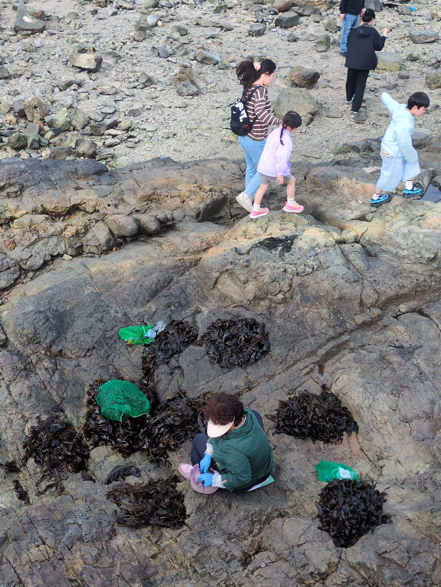 Captured at a coastal location in Busan, South Korea, the image presents a mix of human activity and the natural environment. The primary setting is a rocky shoreline, covered with seaweed. A woman in…read more