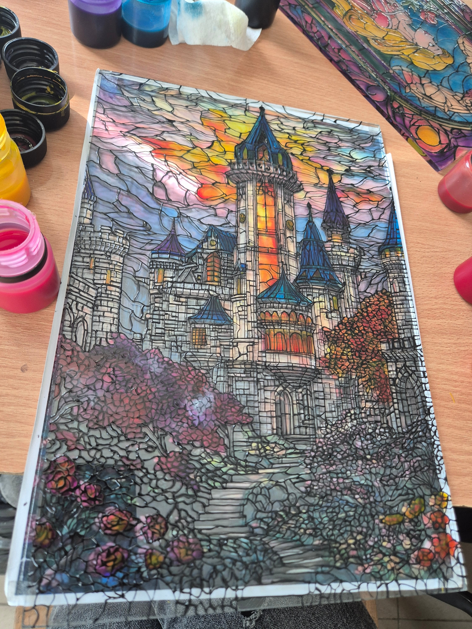 The media file showcases two vibrant artworks, predominantly featuring a large rectangular piece with a stained-glass effect, laid flat on a wooden surface. This main artwork depicts an intricate, fan…read more