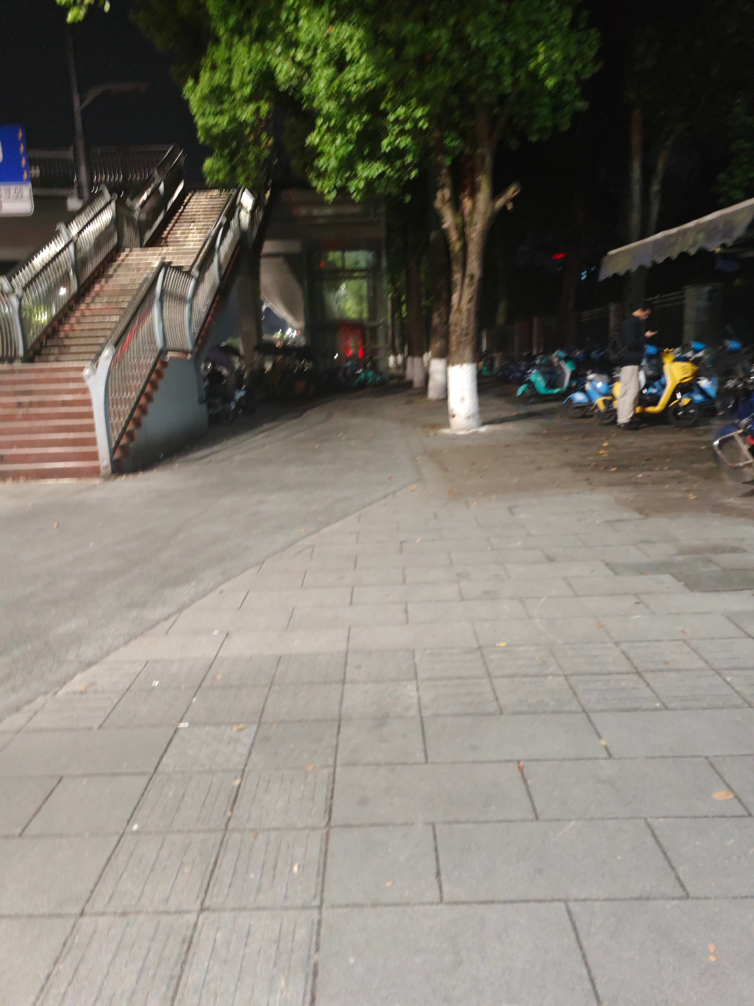 The image shows a street scene at night in Chongqing High-tech Zone, China. A pedestrian overpass is visible on the left side of the image. Several electric scooters are parked under an awning on the…read more