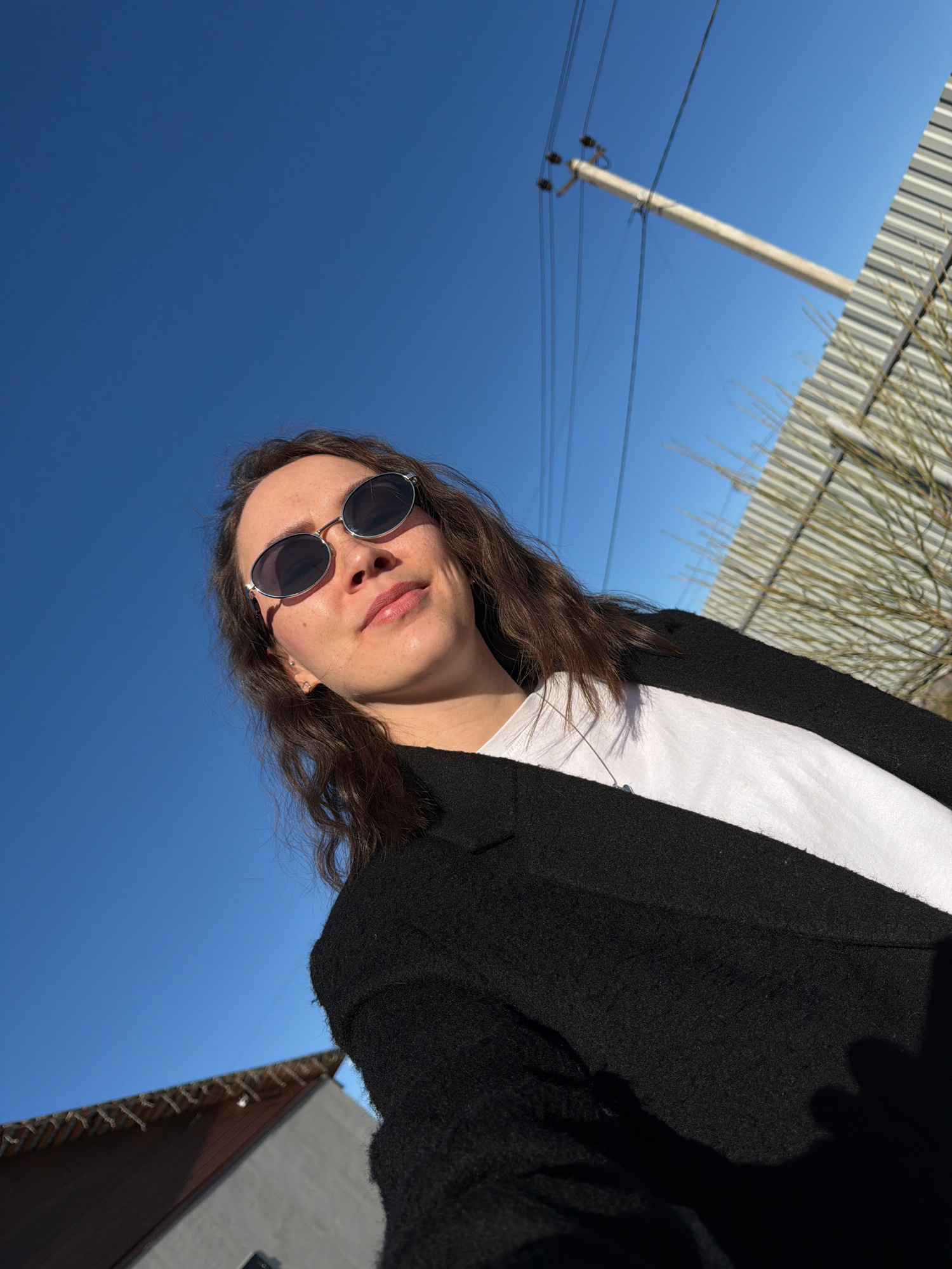 The image is an angled low-angle shot of a woman wearing round sunglasses, a white shirt, and a black blazer. Her hair is wavy and brown. The background is primarily a clear blue sky. In the upper lefβ¦read more