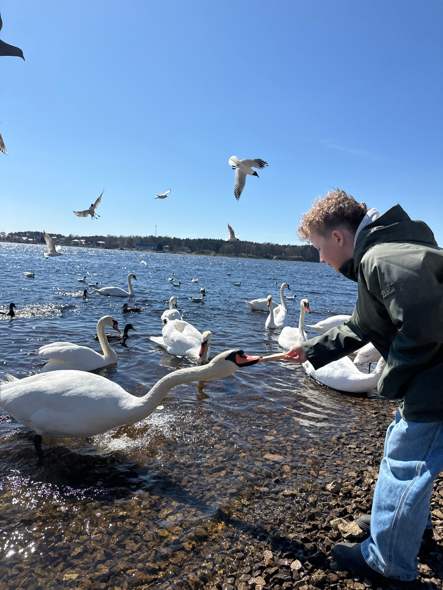 A person is interacting with numerous swans and some seagulls at a waterside location. The individual is bending over and appears to be hand-feeding the swans, which are clustered closely in the water…read more