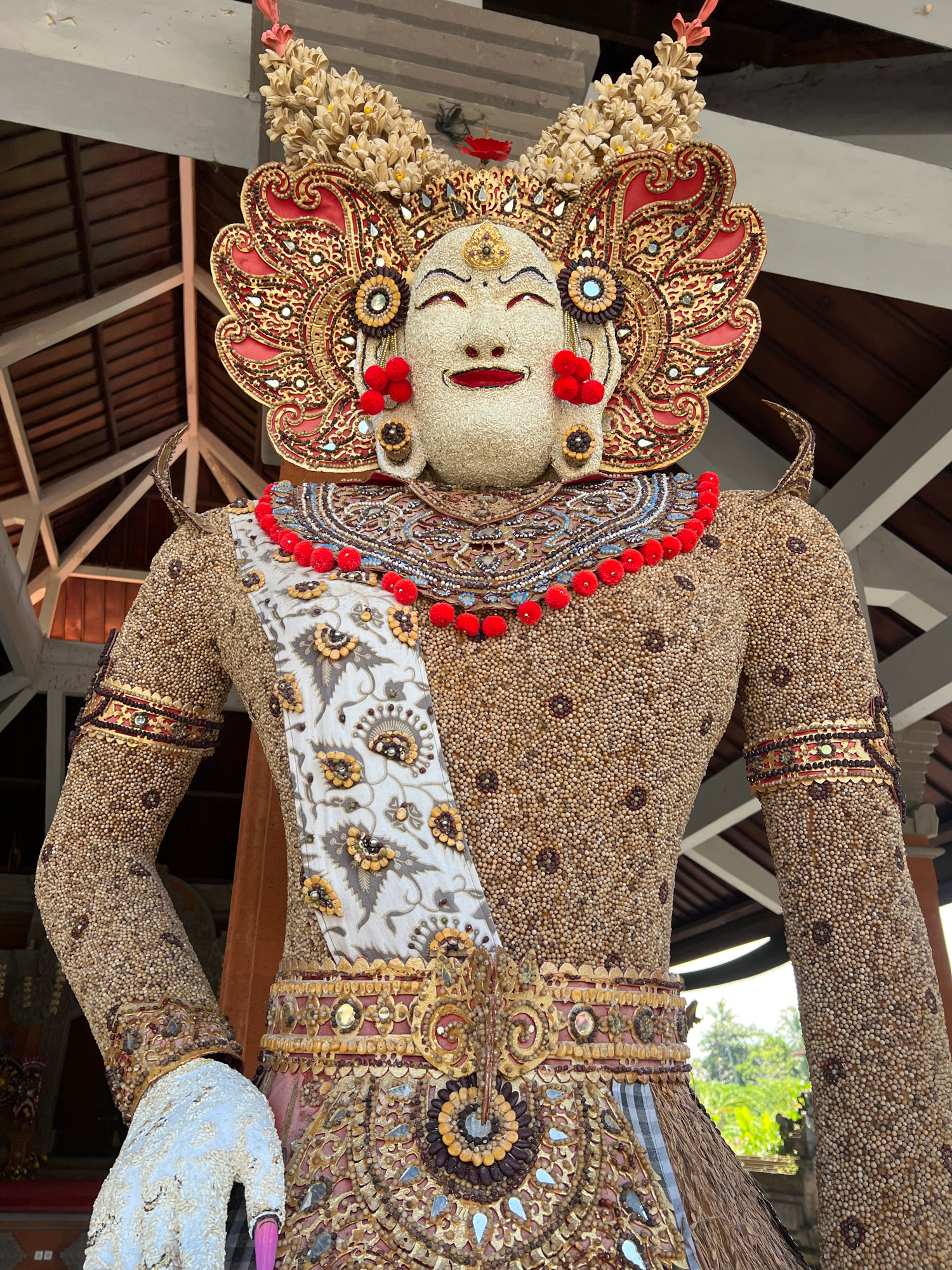 A full-body statue of a Balinese figure is displayed in the city of Ubud, Indonesia. The statue is intricately decorated with seeds, beans, and flowers. The figure has a white face, closed eyes, and r…read more