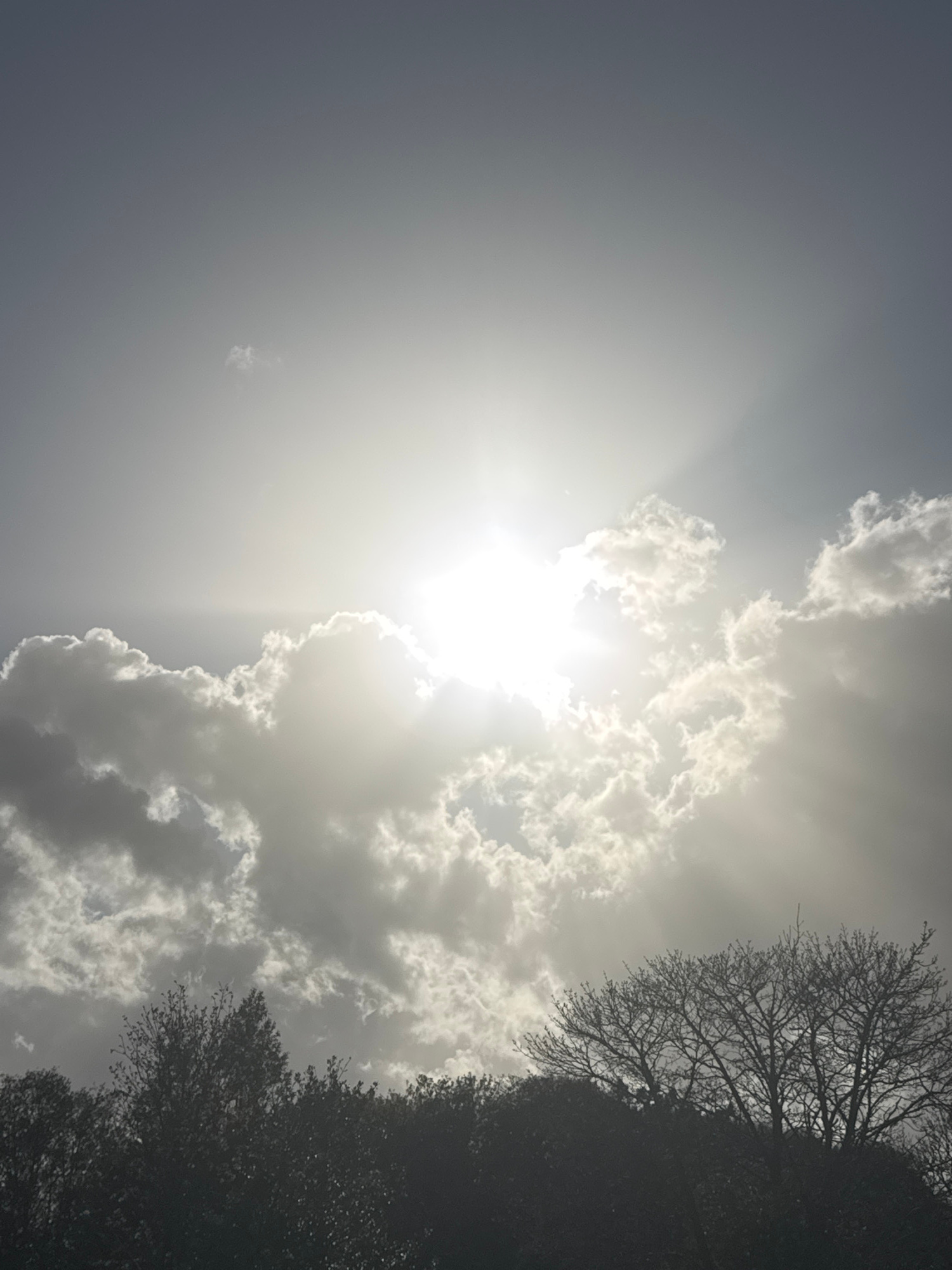 The image depicts a bright sun obscured by clouds in a grayish sky. The sun's rays are visible, shining through the clouds. To the right of the clouds are silhouettes of trees, some with bare branches…read more