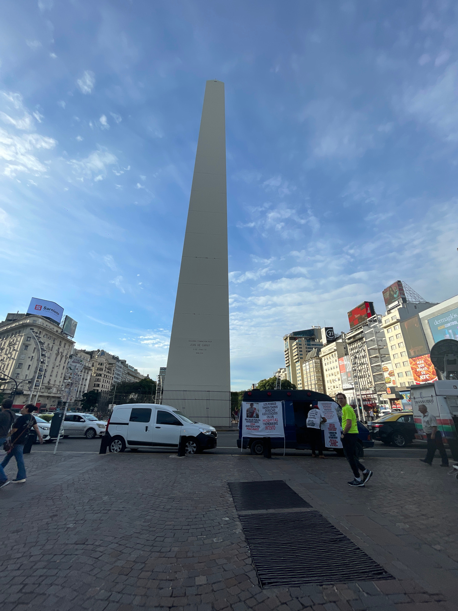 The image shows the Obelisco of Buenos Aires, Argentina, under a blue sky with light clouds. Buildings line the street in the background. In the foreground, there is a paved area with a drain. A white…read more