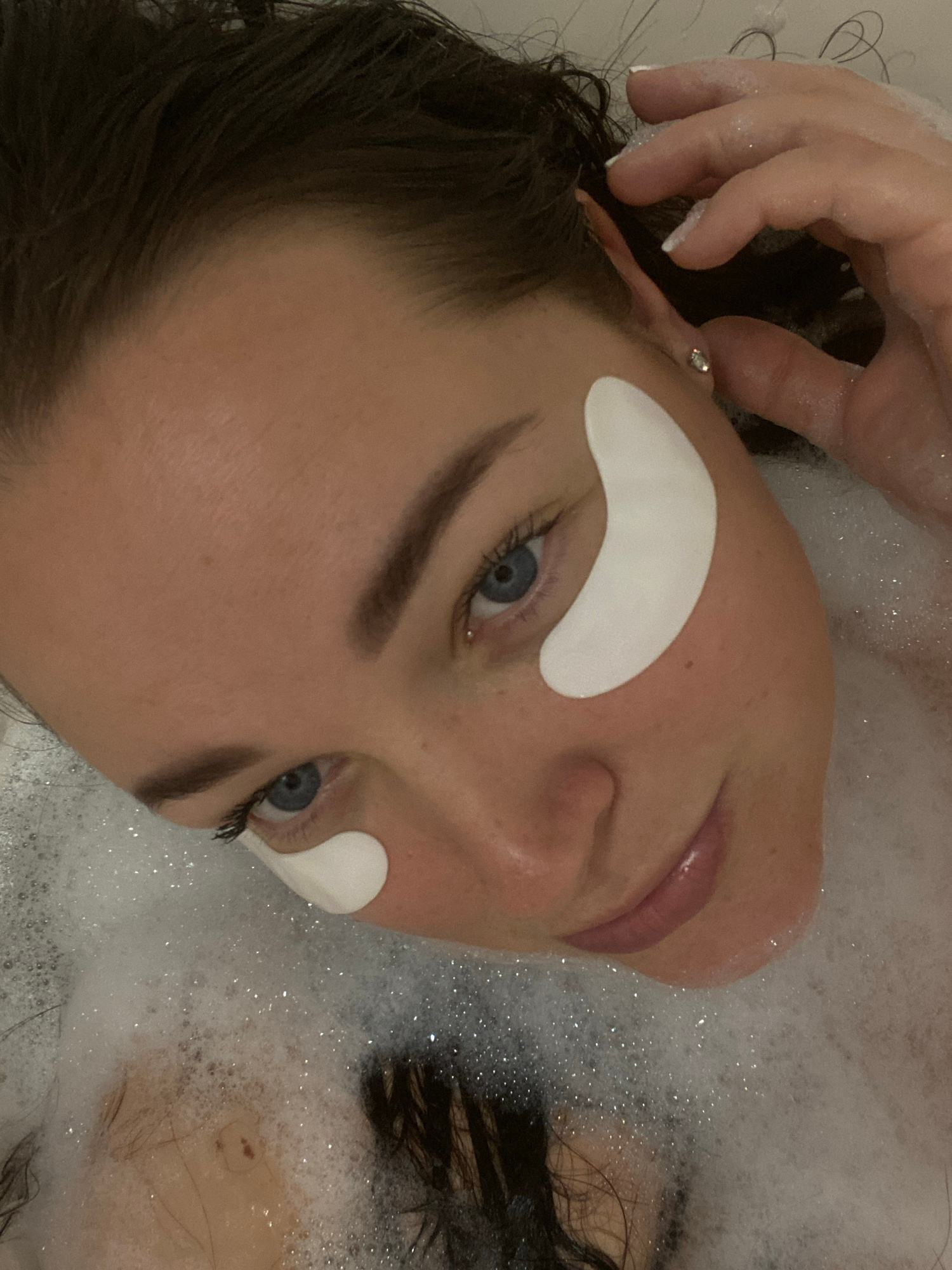 A woman is relaxing in a bubble bath. She has white under-eye patches applied. The photo is taken from an overhead perspective, focusing on her face amidst the bubbles. The woman is partially submerge…read more