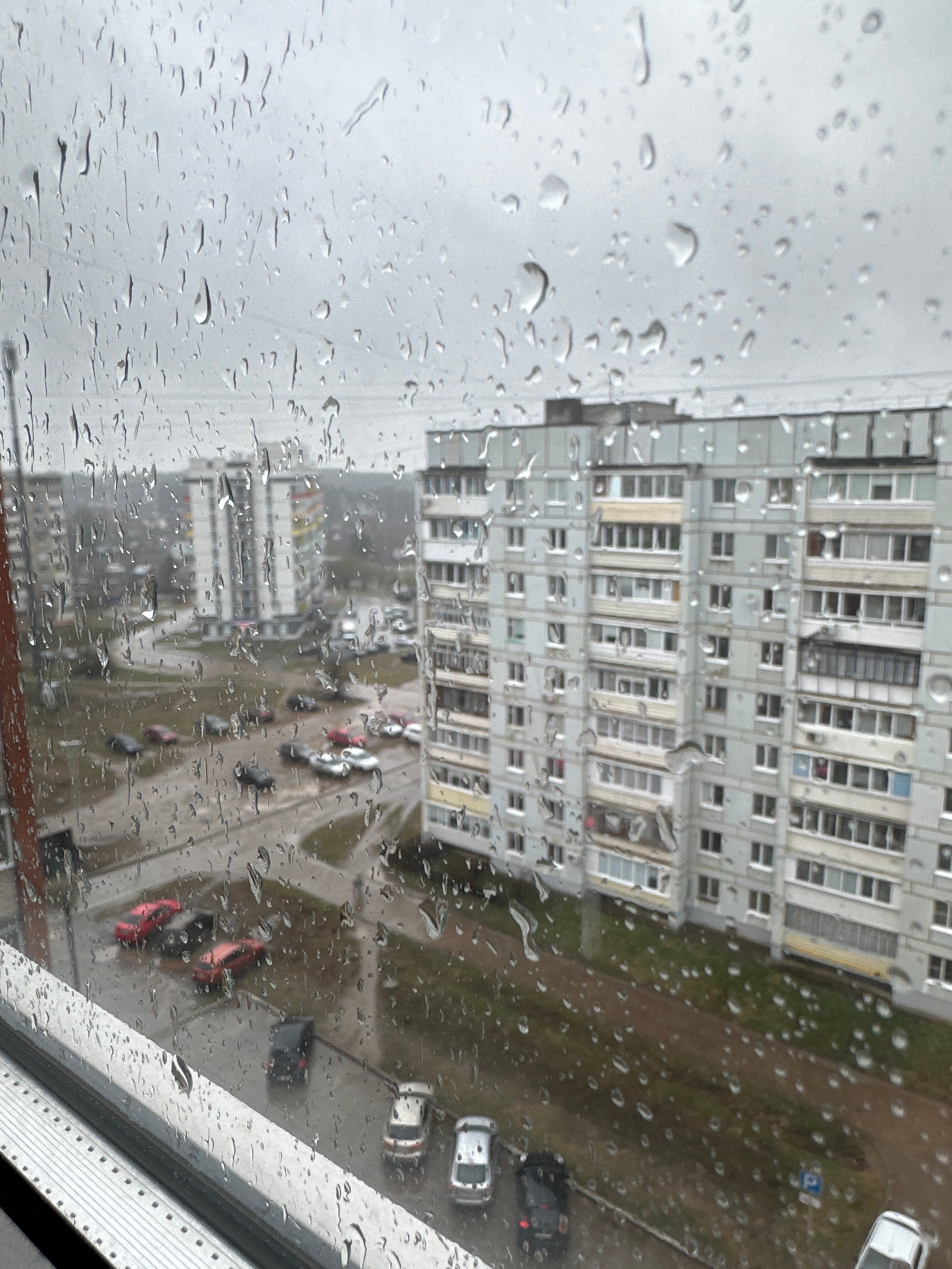 This image captures an overhead view of an urban scene in Chaikovsky, Russia, taken from behind a window heavily covered in raindrops. The foreground is dominated by myriad water droplets of various s…read more