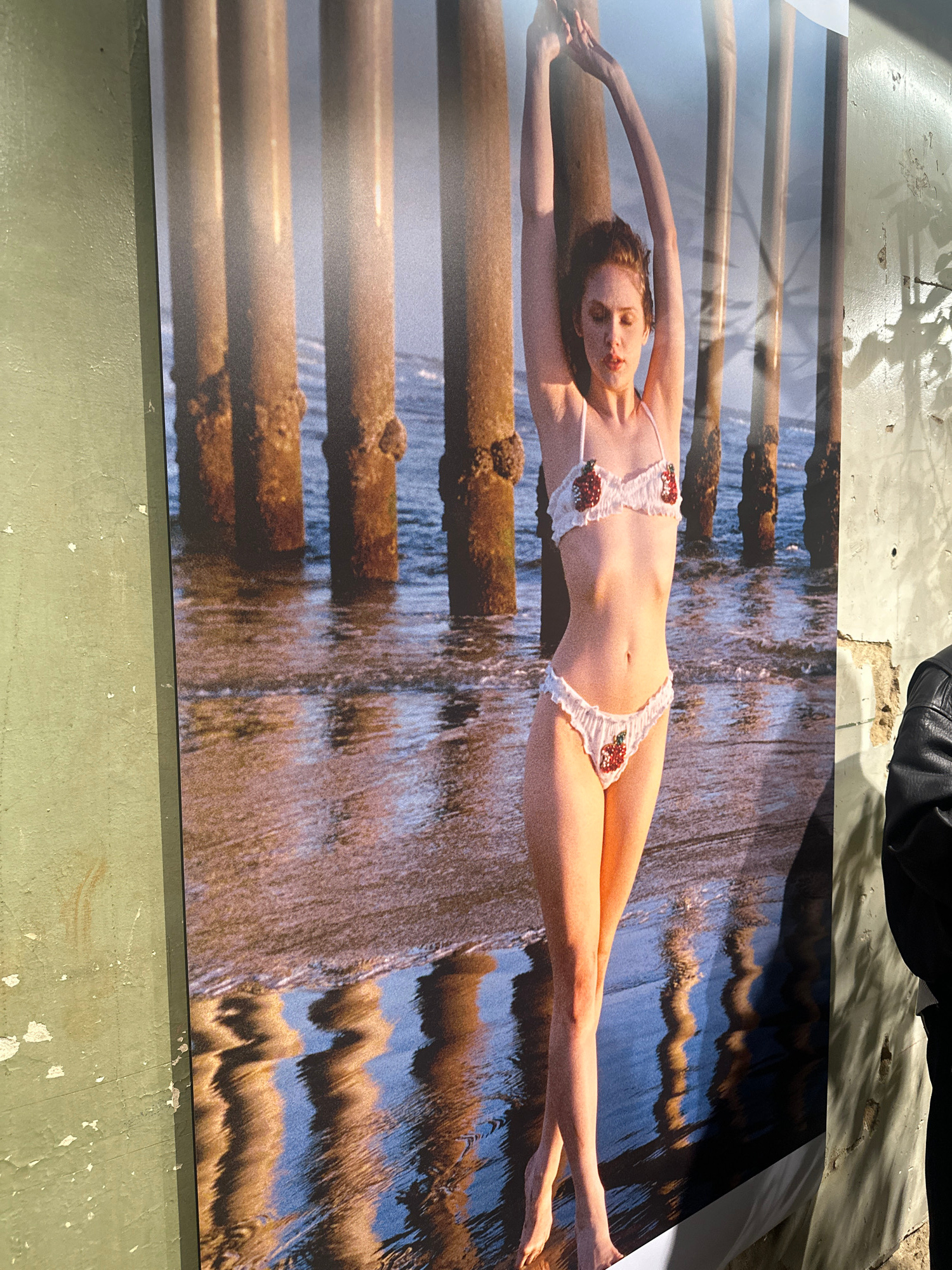 This media file features a large, vertically oriented photographic print displayed indoors. The print depicts a woman lying horizontally across several rustic, weathered wooden logs, over which water…read more