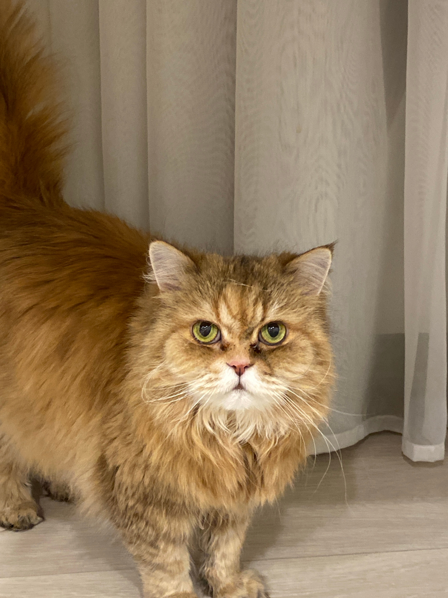 A medium shot, taken from an elevated perspective, captures a long-haired, golden-brown cat with large, green eyes. The cat is positioned primarily to the right of the frame, its head tilted upwards a…read more