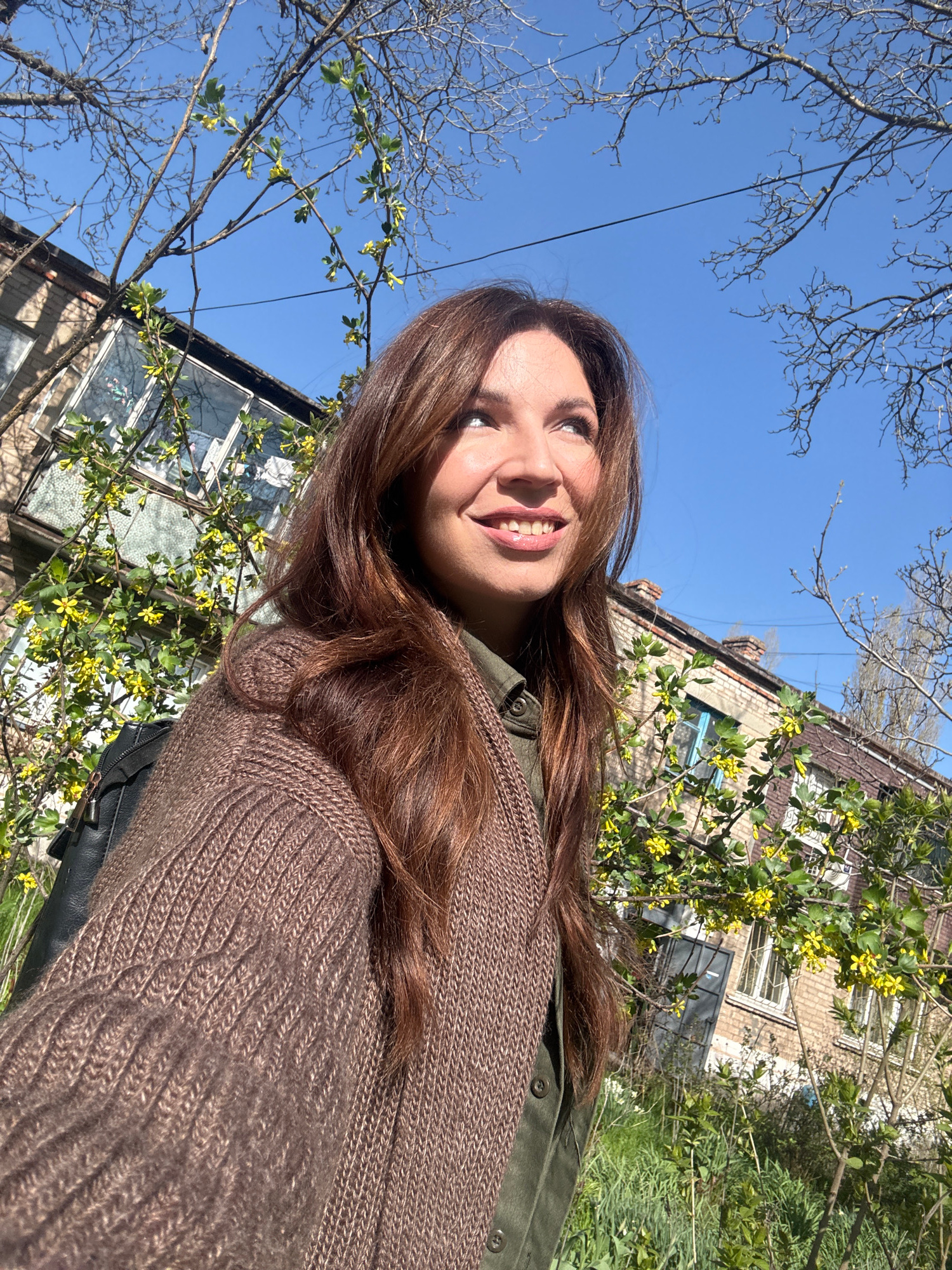 A woman with long brown hair smiles and looks up toward the left of the frame, her face partially lit by sunlight. She wears a brown, textured sweater over a green jacket. The background features buil…read more