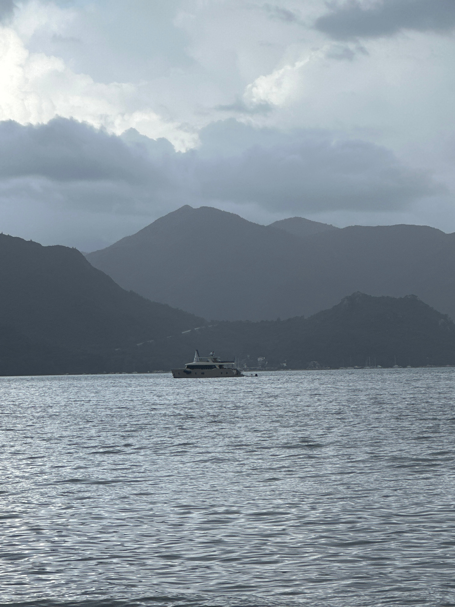 The image depicts a mountain range receding into the distance, partially obscured by clouds, with a body of water in the foreground. A ship is visible on the water near the base of the mountain. This…read more