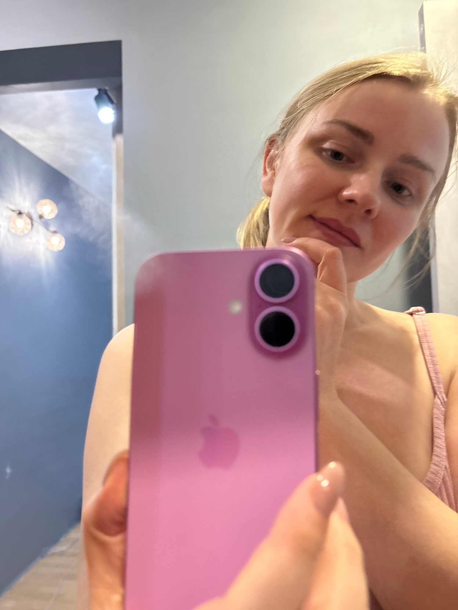 A young, fair-skinned woman with blonde hair is taking a selfie indoors with a pink smartphone. She is wearing a light pink top. The background shows a wall with a light fixture. It's not possible to…read more