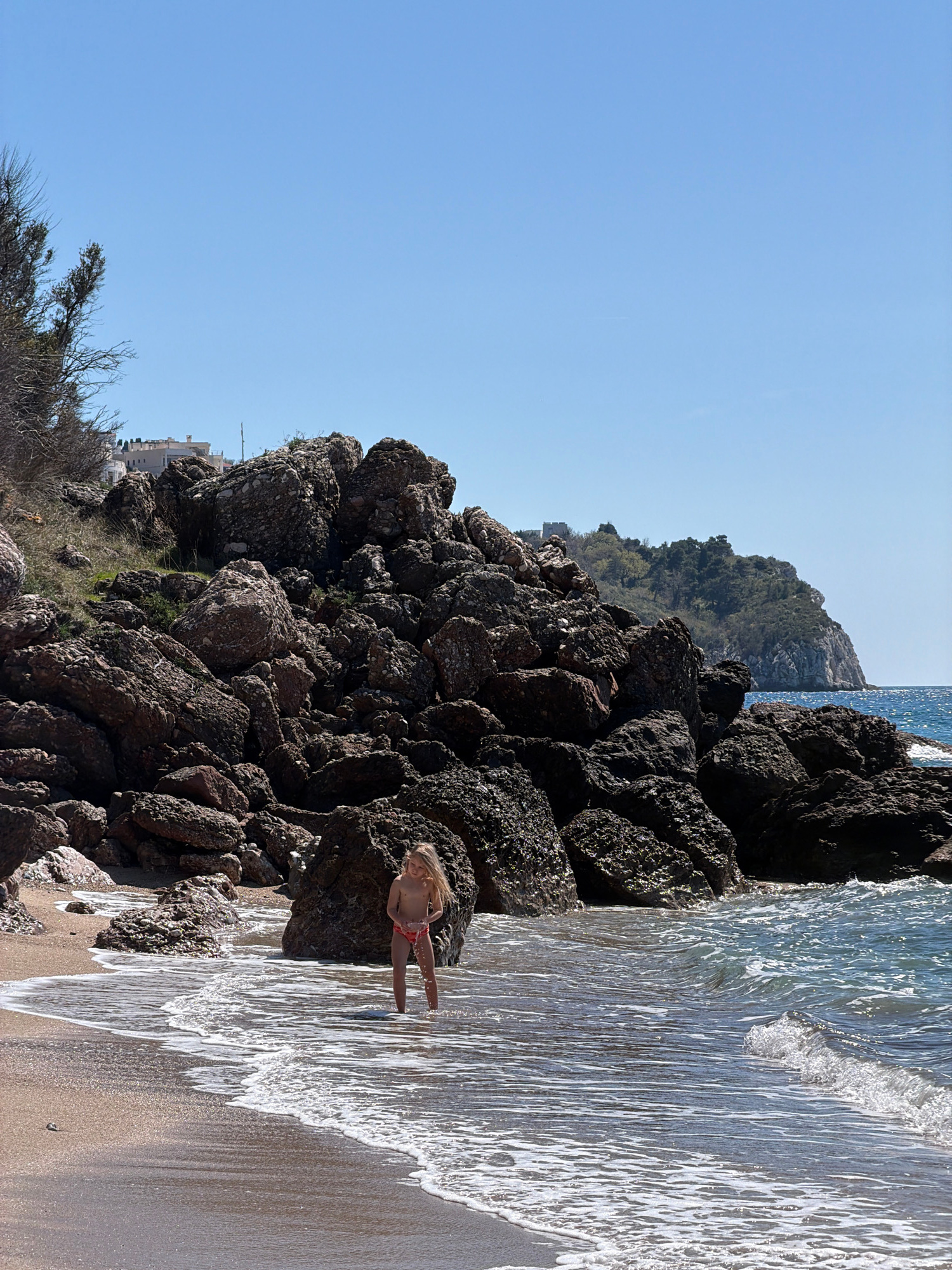 A scenic, sunlit beach scene in Drobnići, Montenegro, presents a rocky shoreline juxtaposed against the gentle wash of the sea. A young girl with blonde hair stands near the edge of the water, her fig…read more