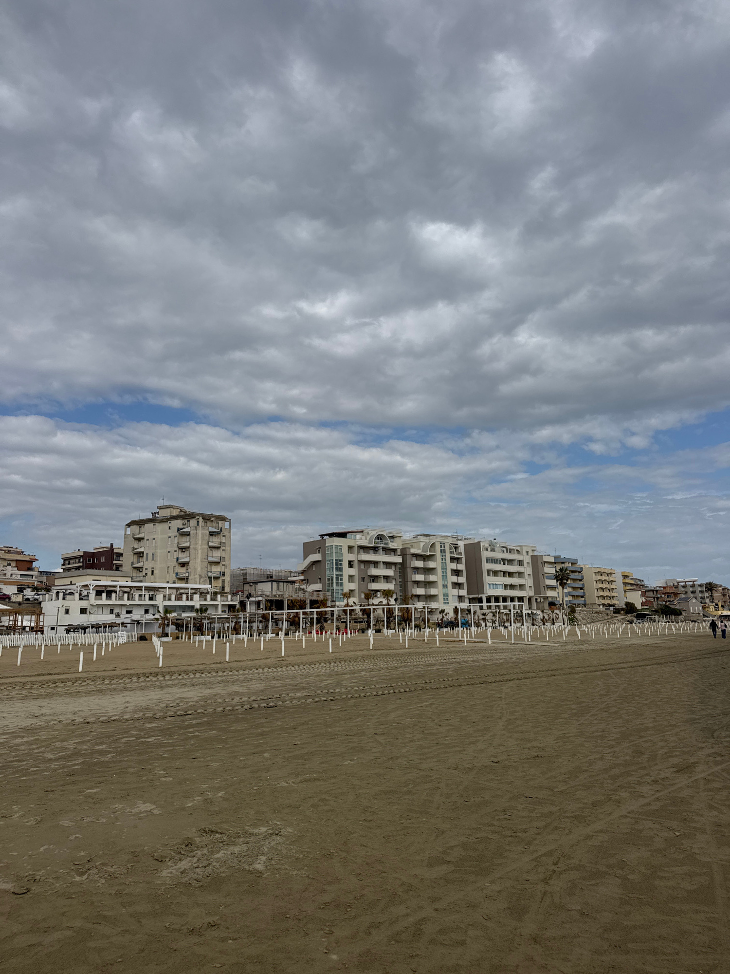 This image presents a wide view of a sandy beach lined with buildings, likely in a coastal town such as Nettuno, Italy. The scene appears calm and devoid of significant activity. The upper portion of…read more
