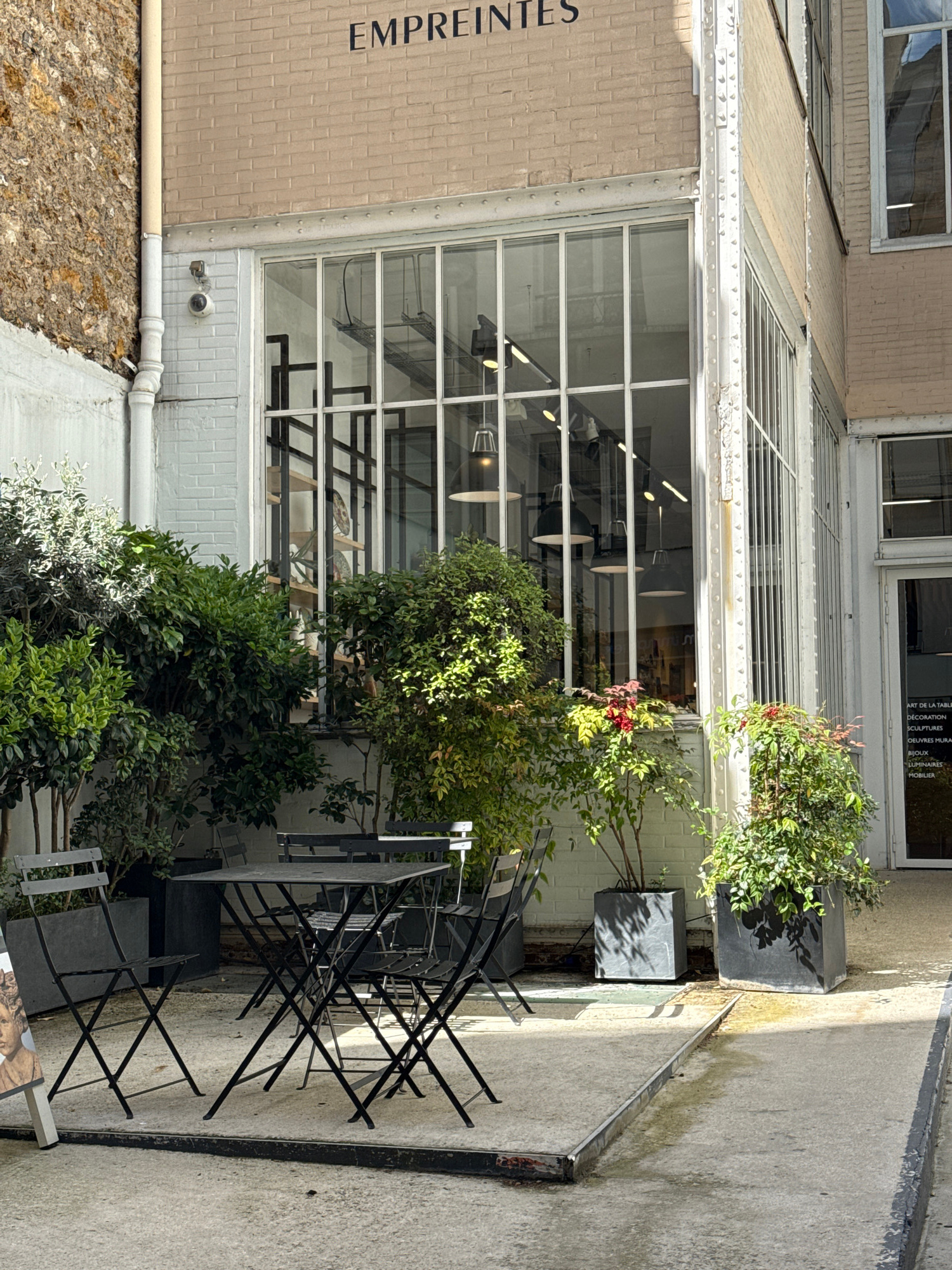 The scene shows an outdoor seating area adjacent to a building facade, likely a commercial establishment in Paris, France, indicated by the architectural style and the French word "Empreintes" visible…read more