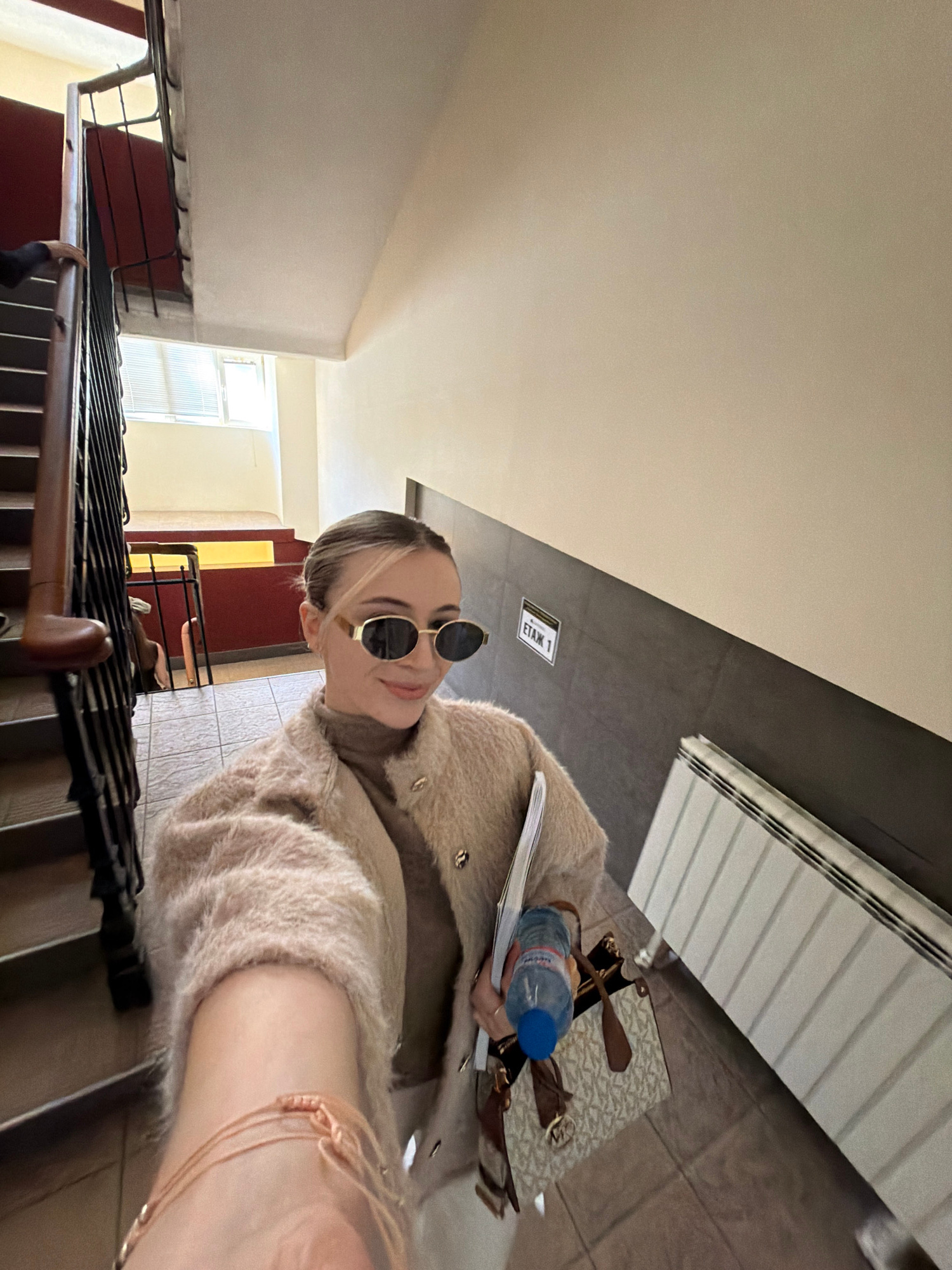 The image depicts a young woman with blonde hair, wearing sunglasses and a fuzzy cardigan, standing on a staircase. She is holding a water bottle and papers. The staircase has metal railings with dark brown wooden handrails. The background shows interior hallway features, including a radiator, a tiled floor, and a doorframe visible through an opening. A small sign reading "ETAK 1" is mounted on the wall. Based on the architectural style and the presence of Cyrillic script on the sign, the location is likely in Plovdiv, Bulgaria, but specific confirmation requires additional information. | Open Wire