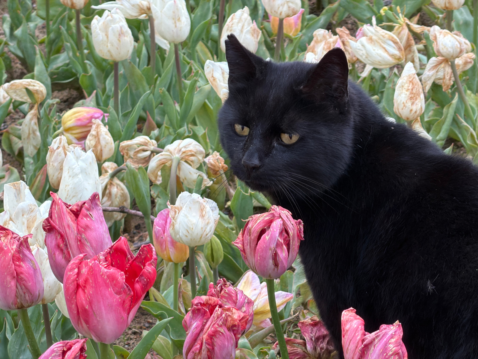 A black cat is partially visible, situated among a flowerbed of tulips in varying states of bloom and decay. The location is implied to be Sarıyer, Turkey. The tulips are a mix of white, pink, and red…read more