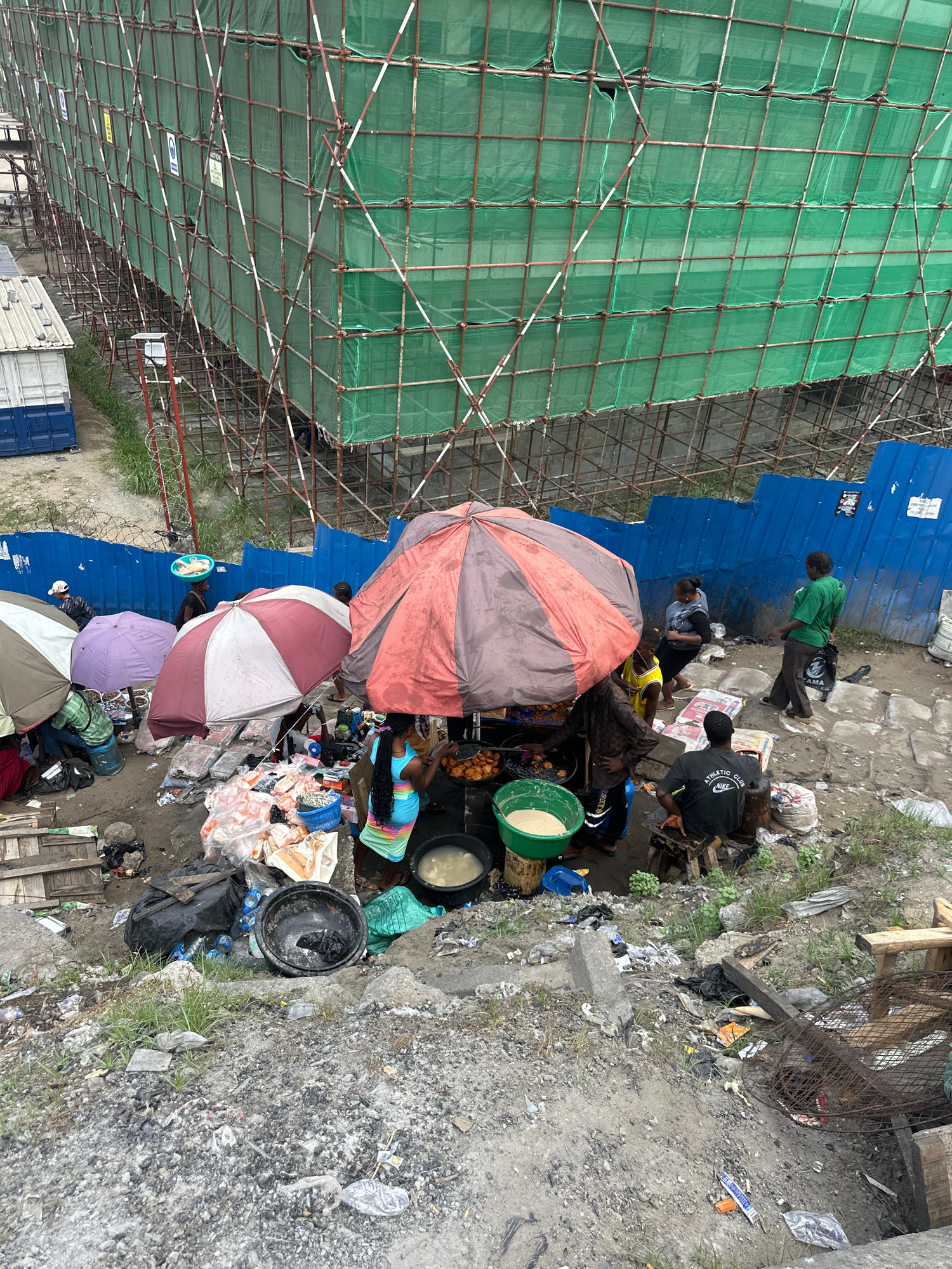 The image depicts an urban scene in Lagos, Nigeria. A large construction site with green mesh scaffolding dominates the left side of the image. Adjacent to the construction site is a bustling market a…read more