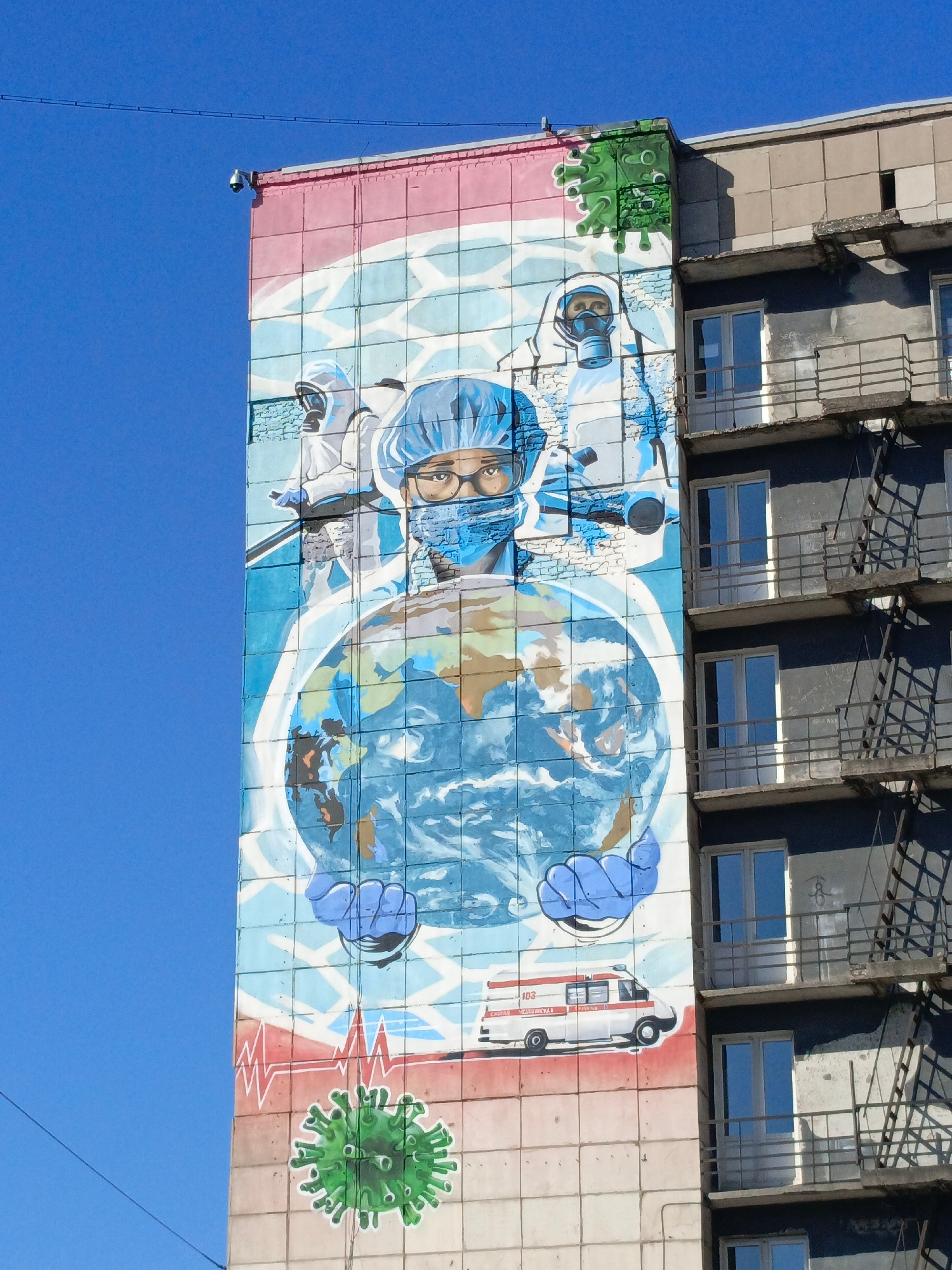 This image depicts a mural on the side of a building in the city of Perm, Russia. The mural is painted on large, square tiles and features medical personnel in protective gear. A central figure wears…read more
