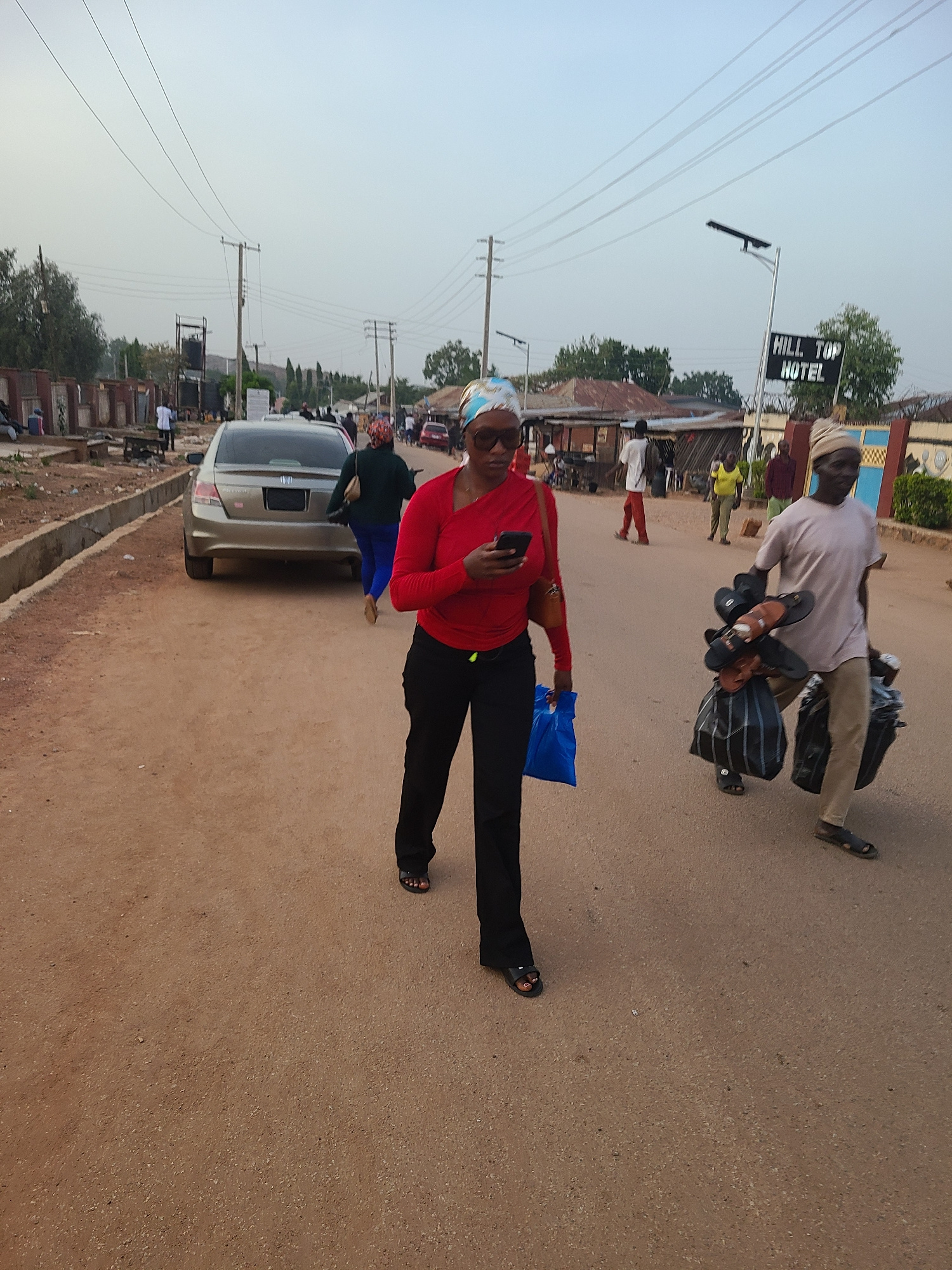 The scene is on a street in Jos, Nigeria. A woman in a red long-sleeved shirt and black pants stands holding a phone and a blue plastic bag. Nearby, a man in a light-colored shirt and pants carries ba…read more