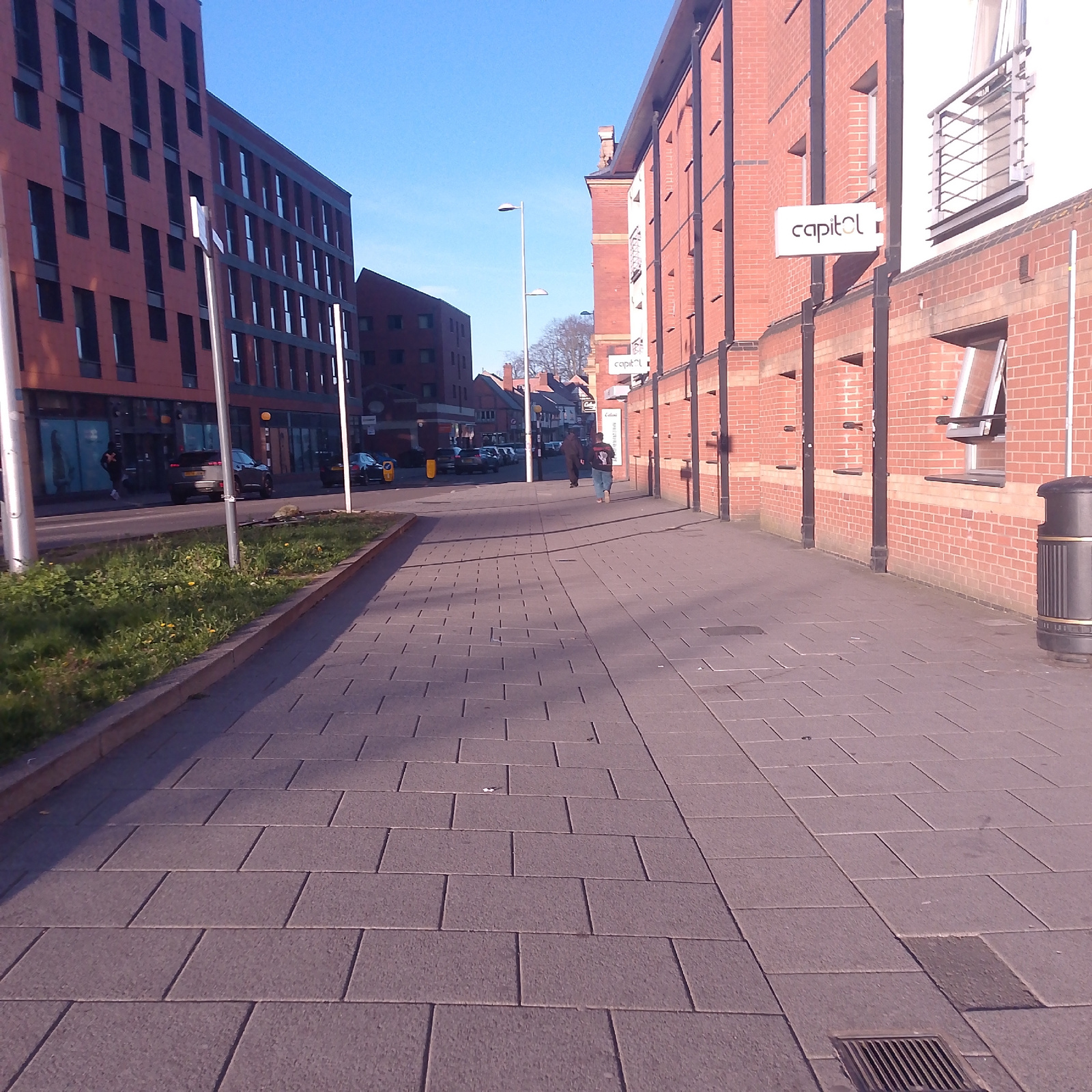The image depicts a street scene in Coventry, United Kingdom. The foreground is dominated by a paved pedestrian walkway made of grey rectangular paving stones. A strip of grass and some sparse vegetat…read more