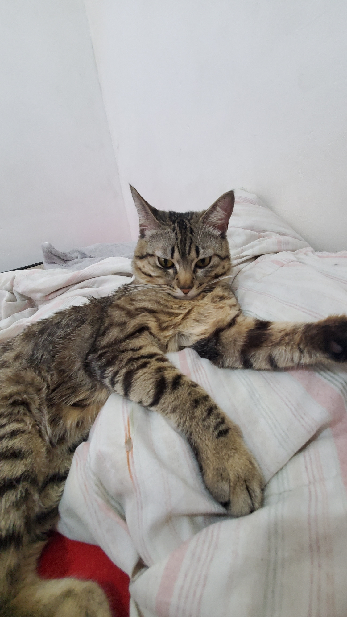 A tabby cat lies on a bed covered with a white, striped comforter. The cat is looking towards the viewer with its front legs stretched out. The background shows a white wall. The image was probably ta…read more