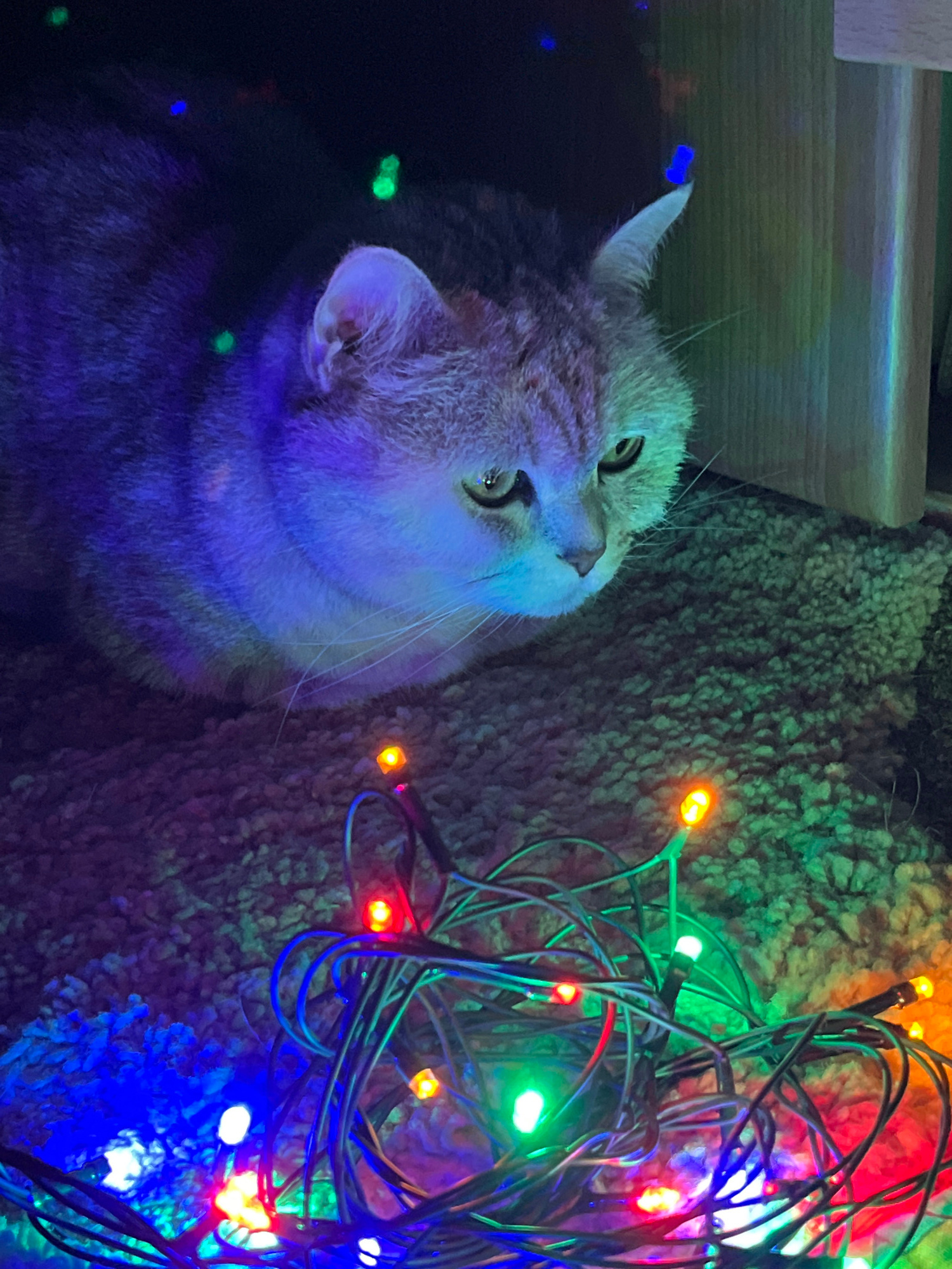 A domestic cat lies next to a string of colorful Christmas lights, its head tilted upward as if watching the lights. The cat appears to be gray with stripes and a white underside. The Christmas lights…read more